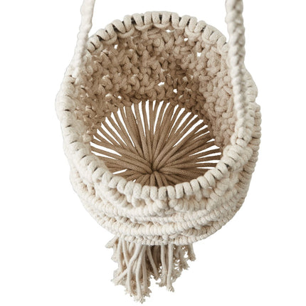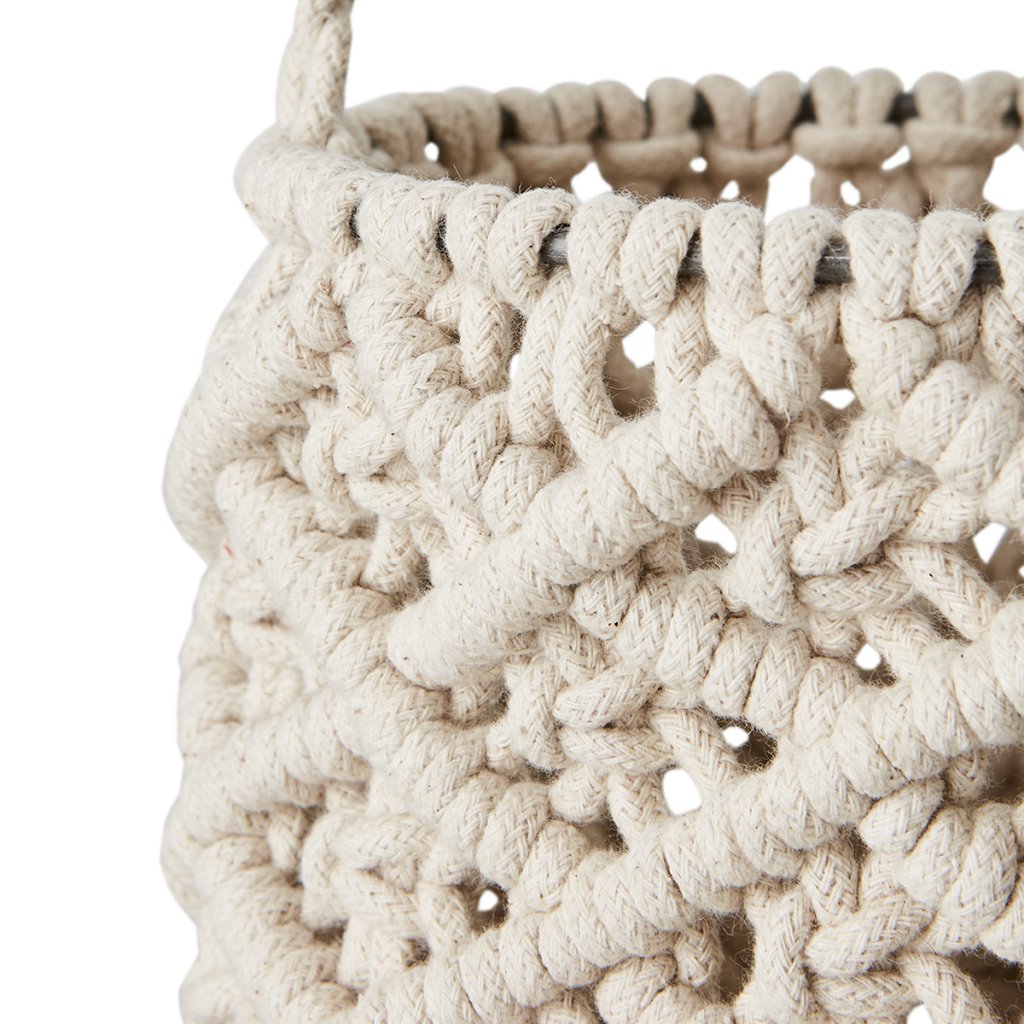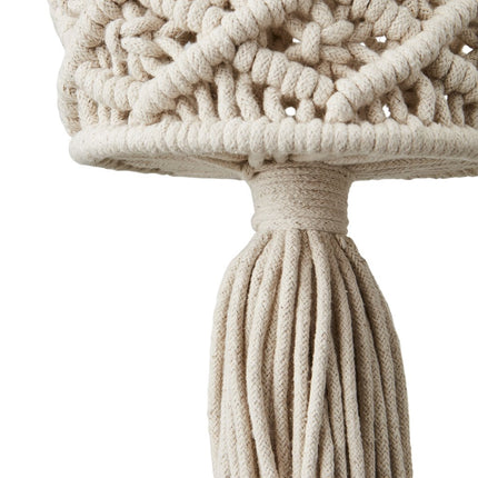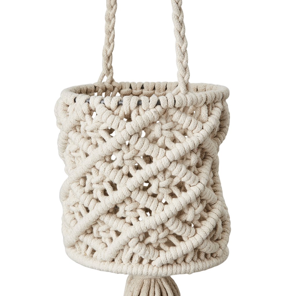 Handknuten ampel i makramé med ett dekorativt mönster och tofs, tillverkad i naturmaterial. Perfekt för att låta dina växter ta plats och ge rummet liv och grönska. Häng den i ett fönster eller från en krok i taket och skapa en mjuk, bohemisk känsla i hemmet. Då varje ampel är handgjord kan små variationer förekomma – en del av hantverkets charm.