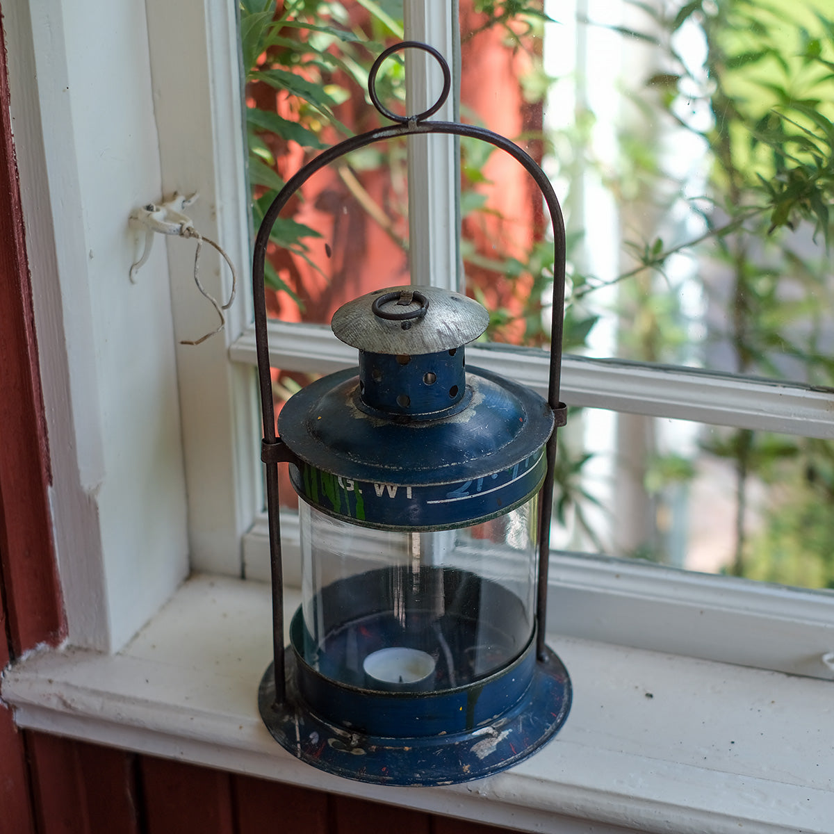 Ljuslyktan kan hängas upp i öglan eller placeras direkt på ett bord eller en hylla, ute eller inne. Färger och detaljer varierar, men alla har inslag av blått i olika nyanser.