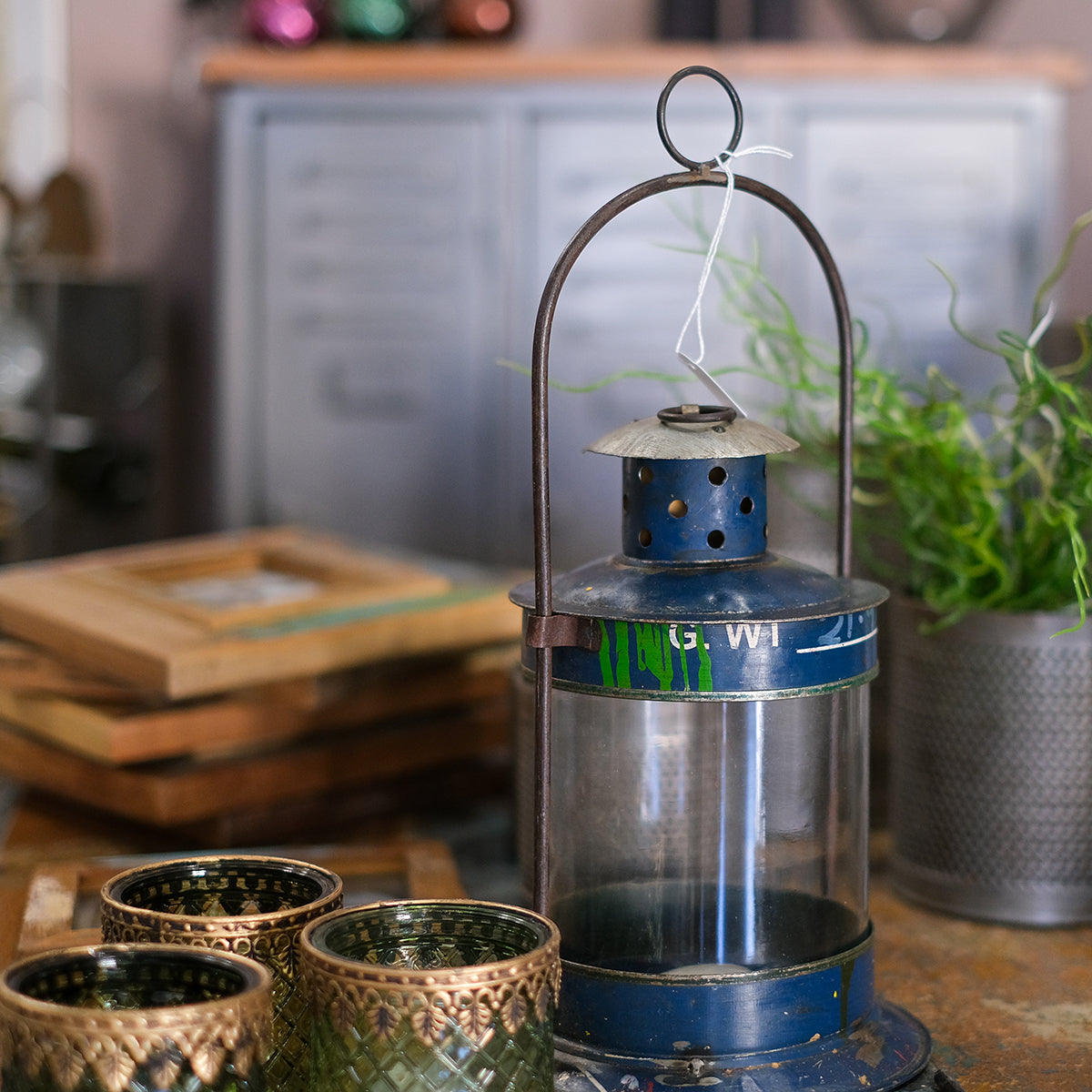 Stämningsfull ljuslykta tillverkad av återvunnen metall och glas i Indien. Varje lykta är unik och bär spår av tidigare liv – med bucklor, textfragment och färgstänk som vittnar om en historia långt bortom massproduktion. Det är precis det som gör dem så charmiga.
