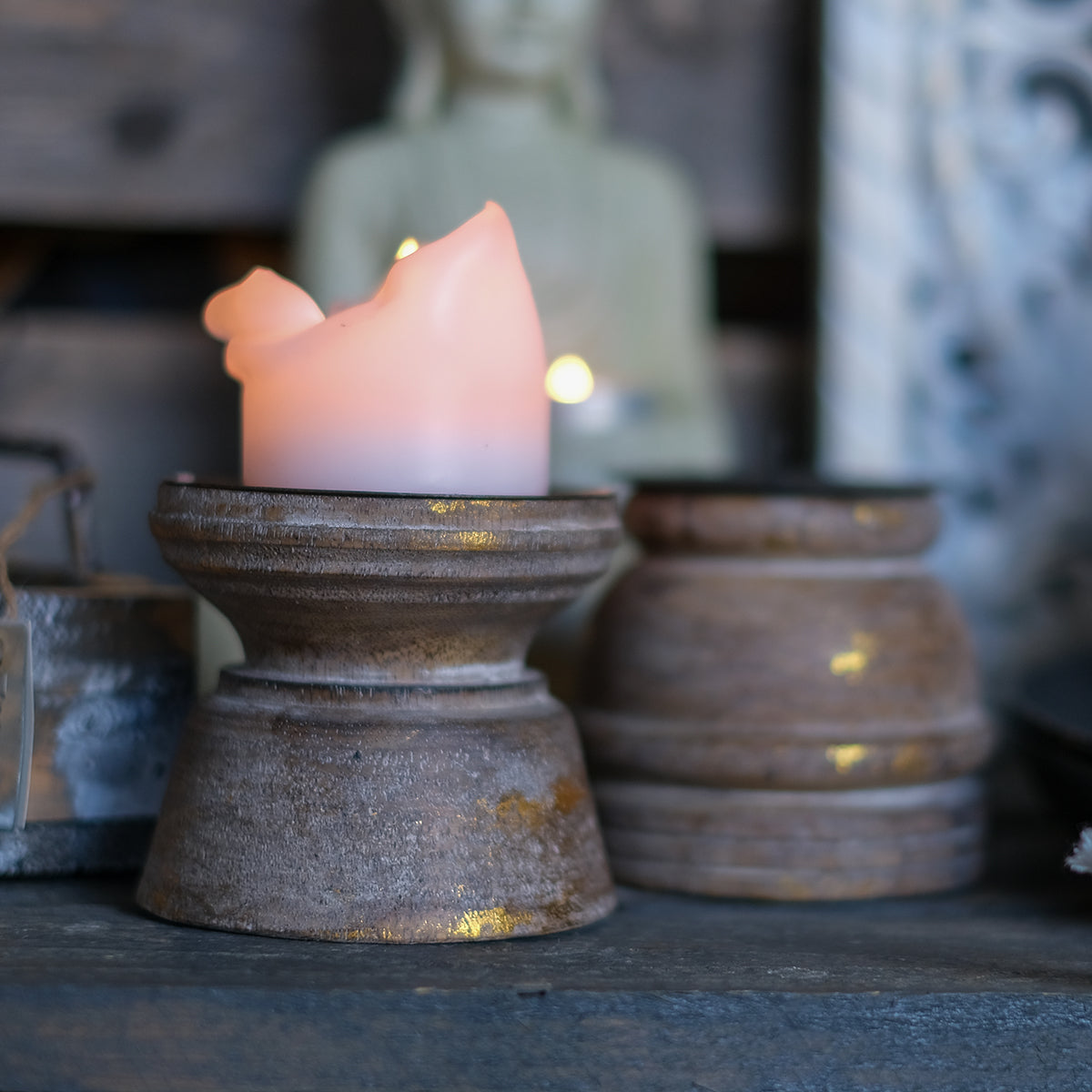 En vacker blockljusstake i mangoträ med guldinslag som ger en varm, levande känsla. Varje ljusstake är unik med sitt eget uttryck tack vare den naturliga ådringen i träet och den handarbetade finishen. Lika fin på matbordet som i fönstret eller på sideboardet – en liten detalj som sprider stor stämning.