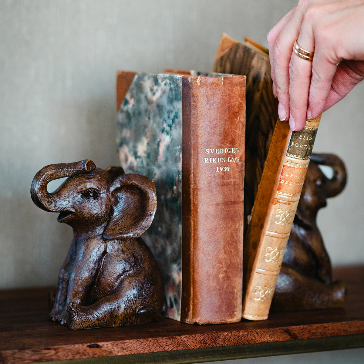 Mysig liten elefant som gärna hjälper till att hålla ordning i bokhyllan. Trots sin lekfulla form är den tillräckligt stadig för att hålla böckerna på plats. Pris per styck.