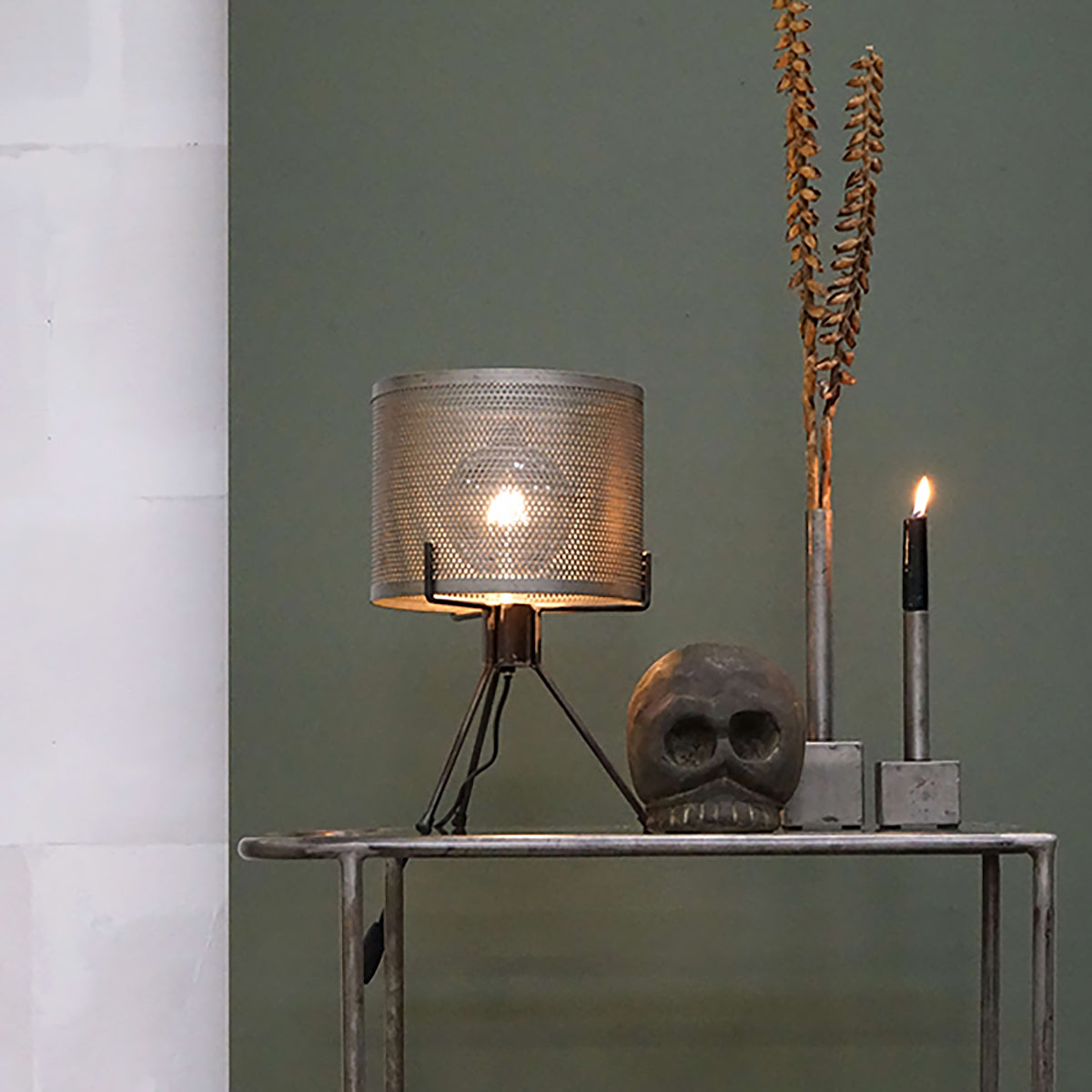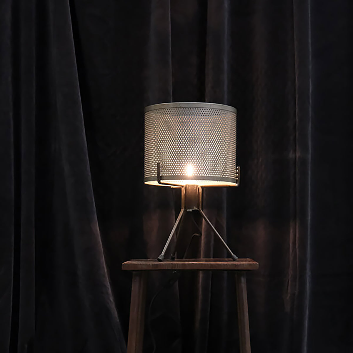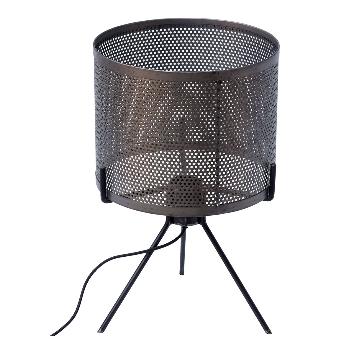En rå, rustik bordslampa med ben som ger både karaktär och ett stämningsfullt ljus. Metallens perforerade mönster skapar vackra skuggspel och en behaglig atmosfär. Perfekt för dig som vill ha en industriell känsla i hemmet. Passar lika bra i vardagsrummet som på ett sideboard eller i hallen.