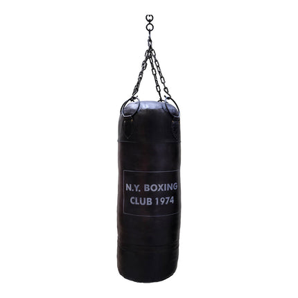 Boxningssäcken är tillverkad i gammaldags stil av svart läder med järnkedjor för upphängning. Den är fylld med återvunnen bomull.