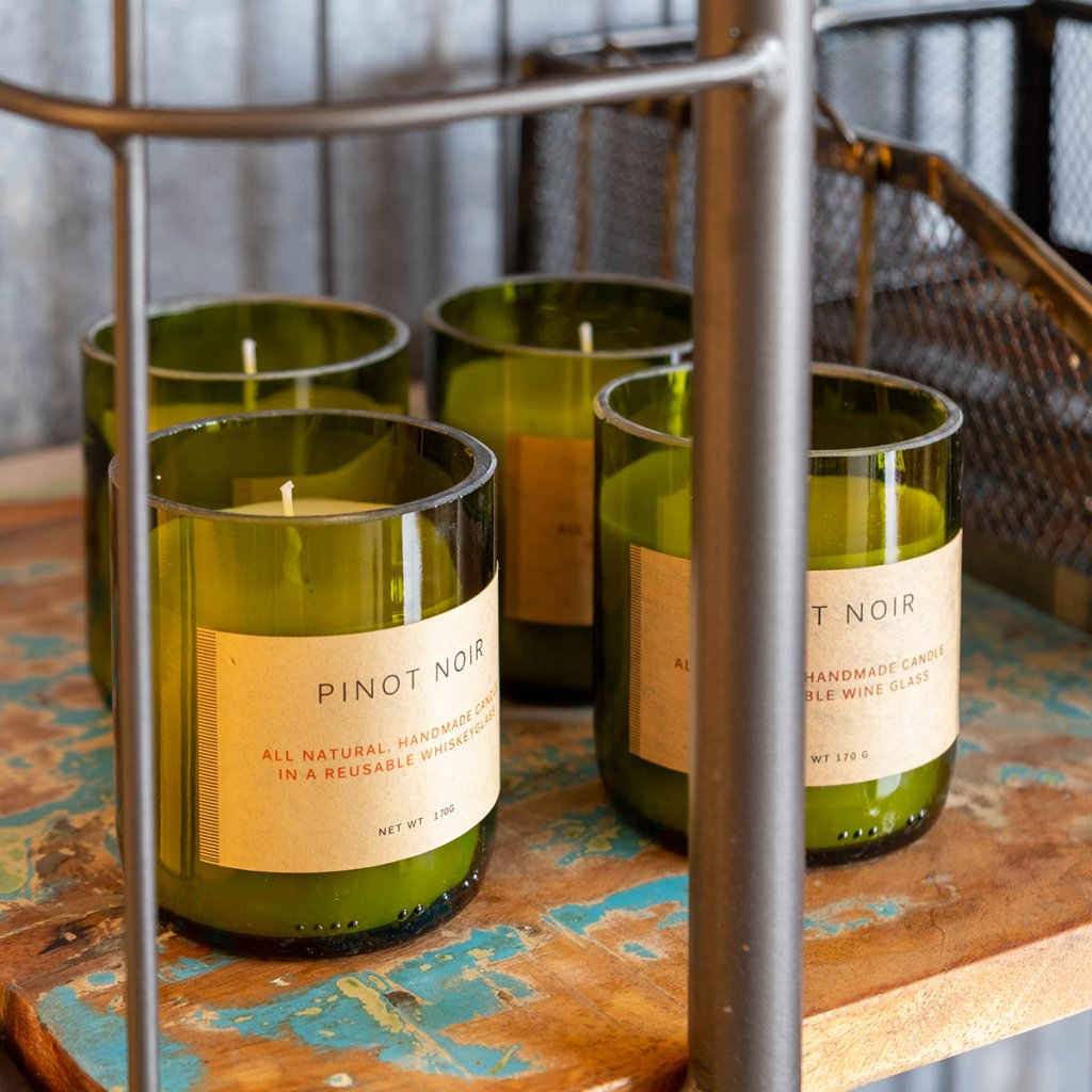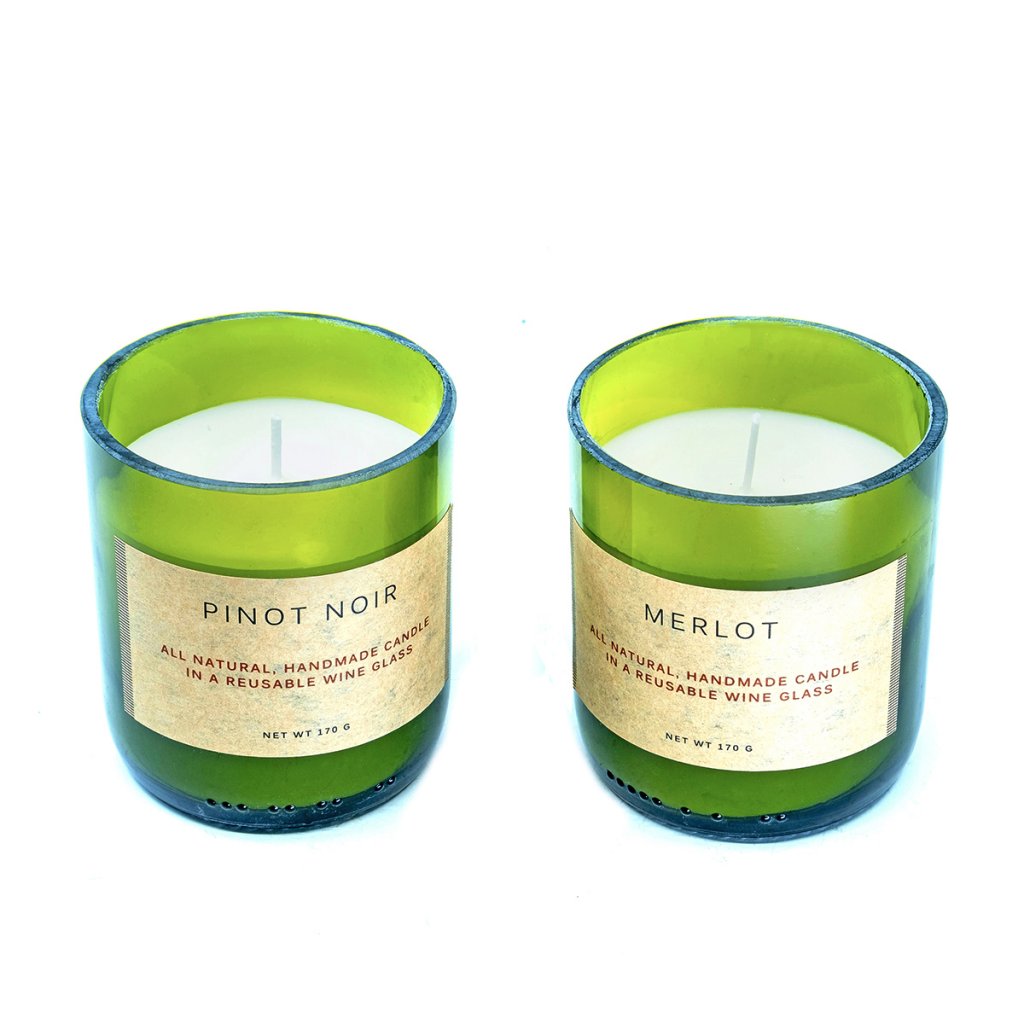 Välj mellan druvorna Pinot Noir och Merlot i gamla återanvända vinflaskor.