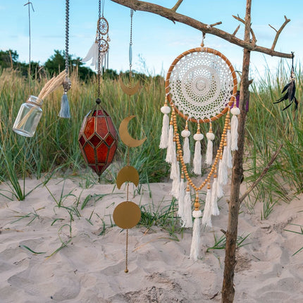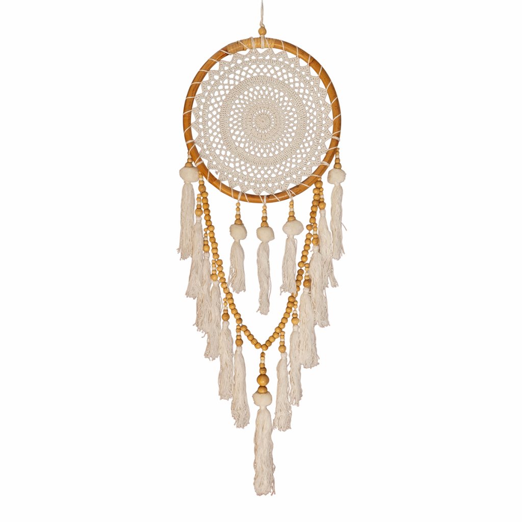 En rejält tilltagen drömfångare med tillhörande pompoms. Ring av trä, fint broderat mönster och träkulor gör att det här är en drömfångare som skiljer sig från mängden!