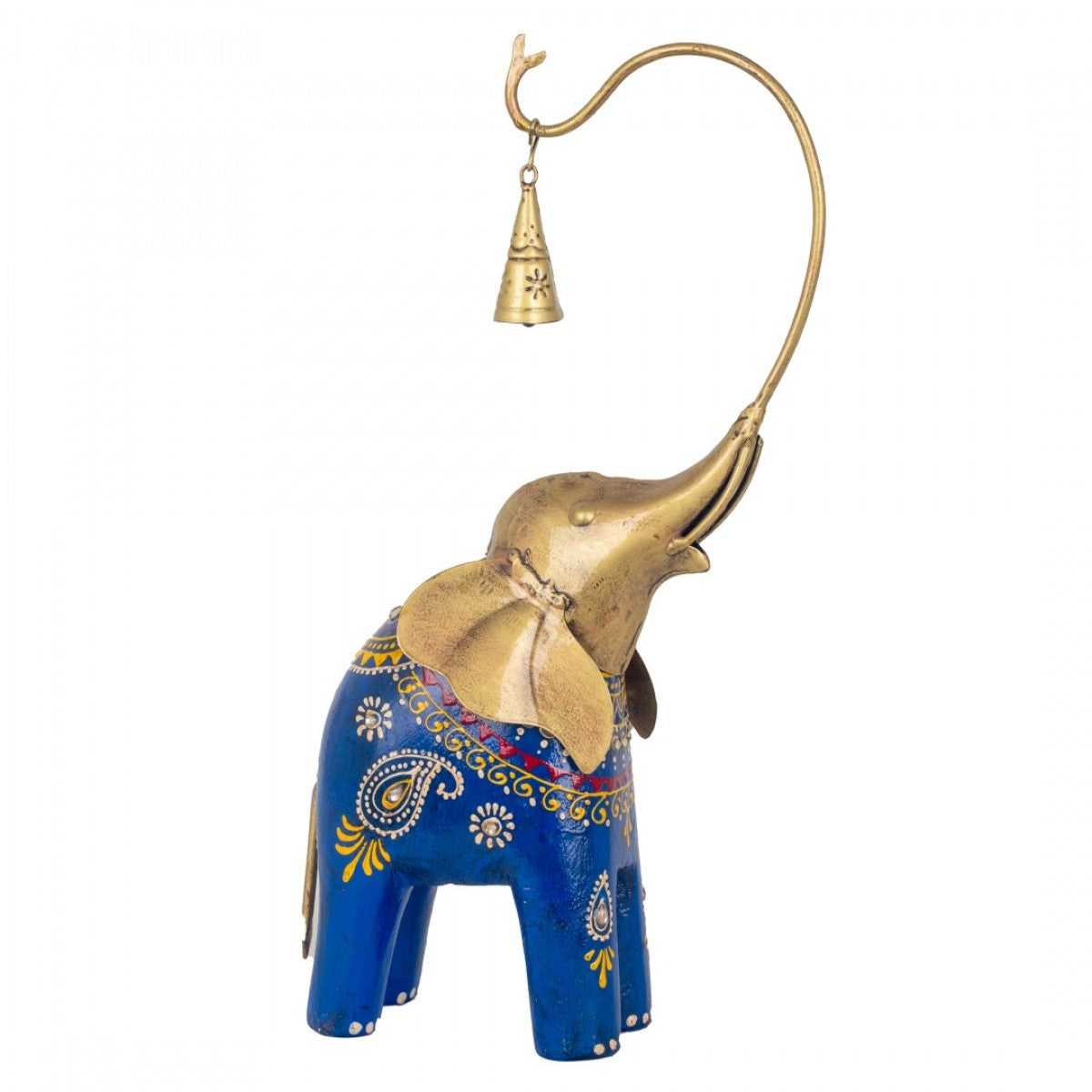 Superfin handmålad elefant i metall, med dekorativa mönster och en liten bjällra som hänger i snabeln. En stor, uttrycksfull och vacker inredningsdetalj som drar blickarna till sig.