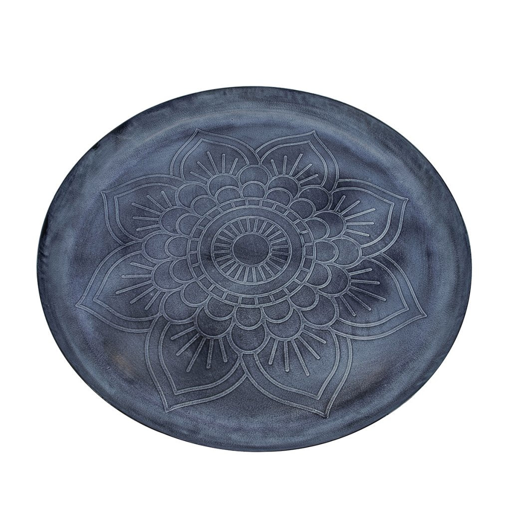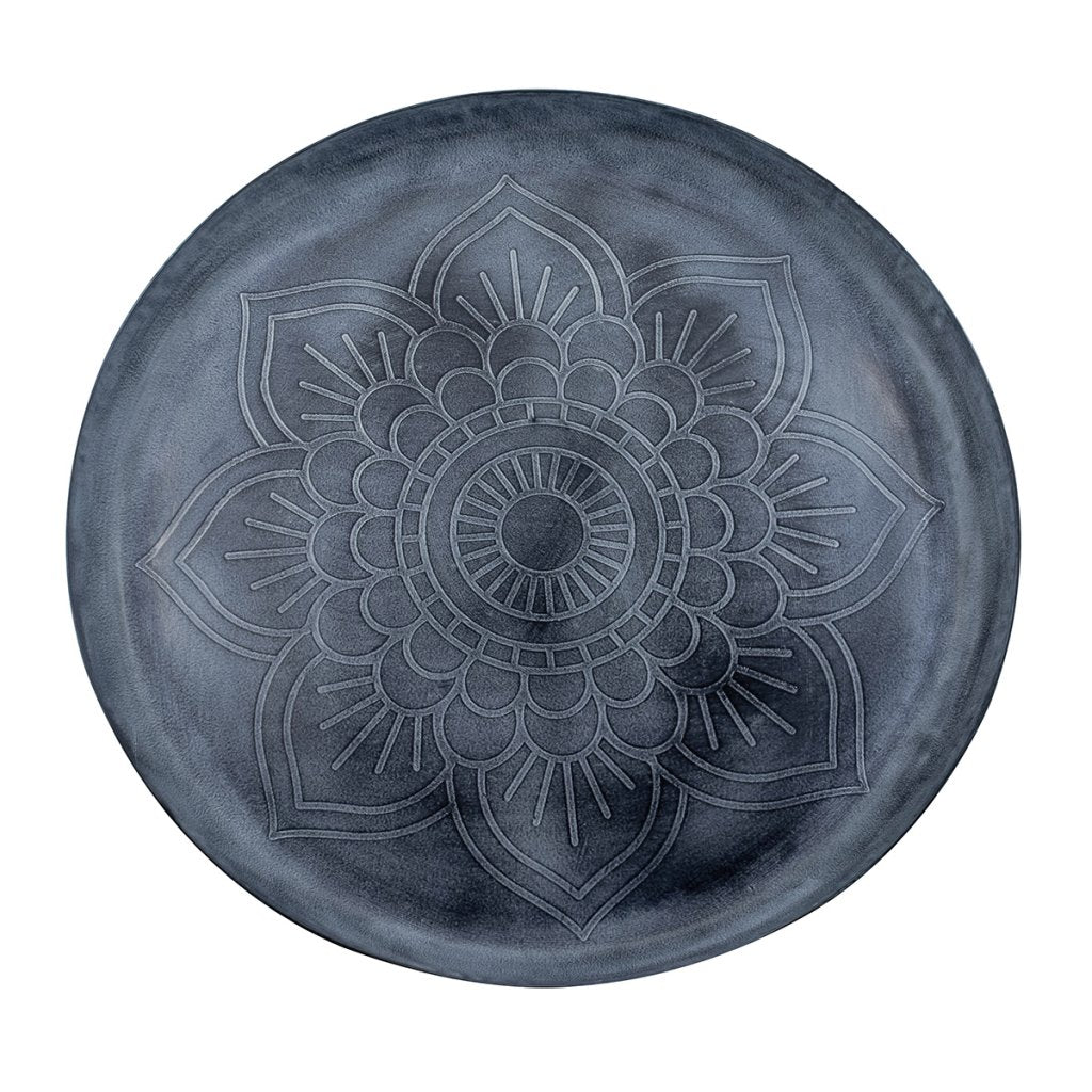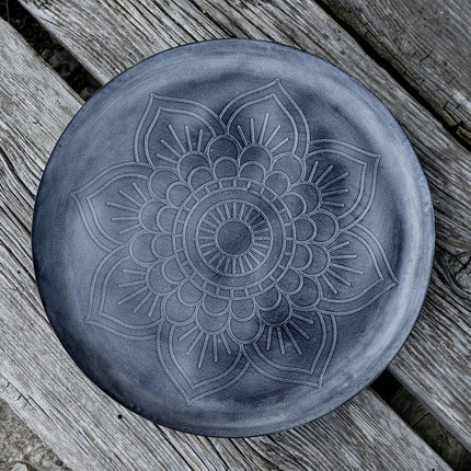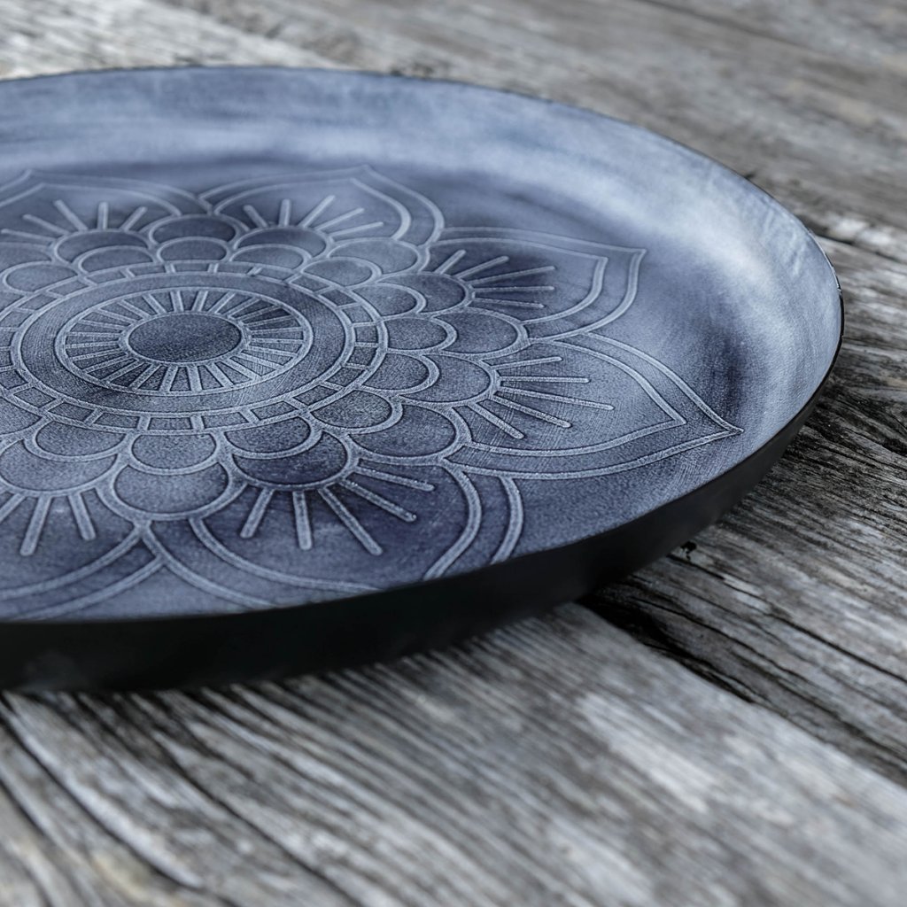 Vackert metallfat med mandala-mönster i vitt på svart.