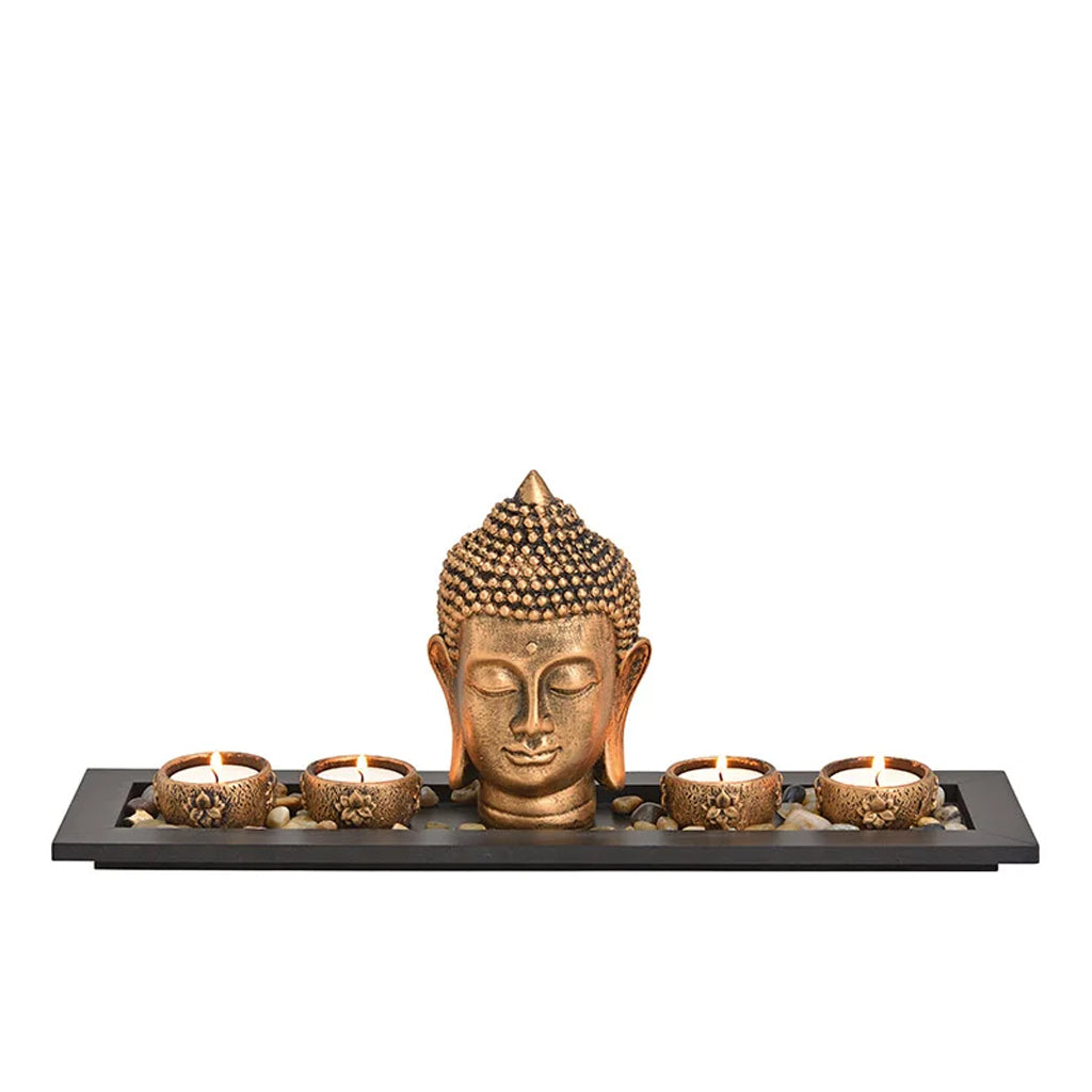 Svart träfat med tillhörande guldfärgat Buddha-huvud och fyra vackert mönstrade värmeljushållare. Dessutom ingår en liten påse med stenar att dekorera fatet med.