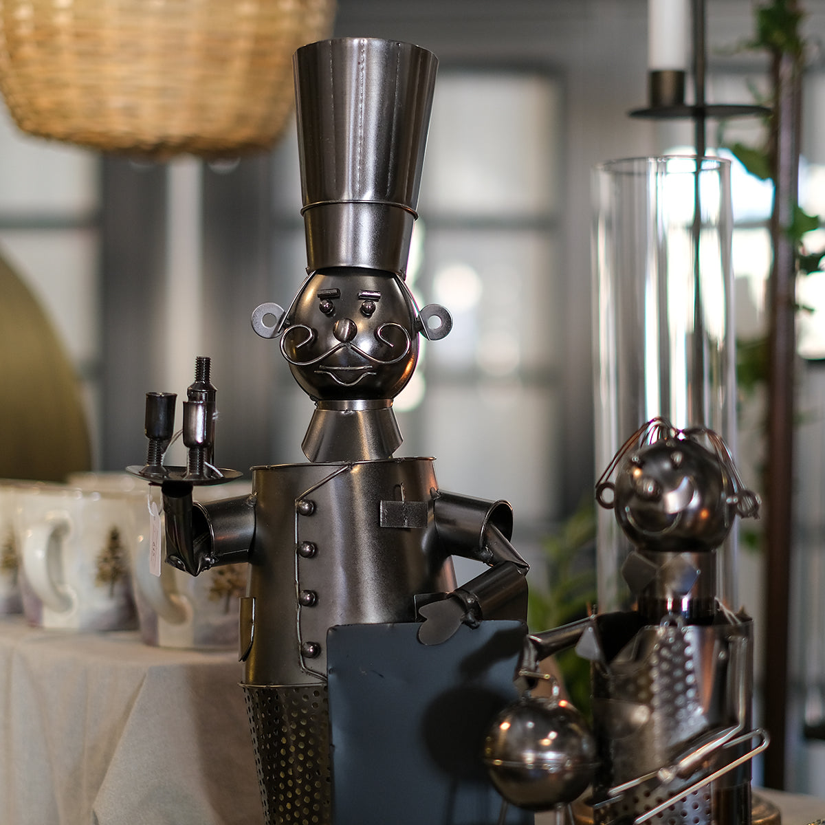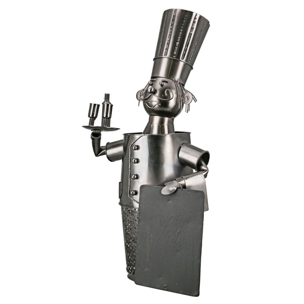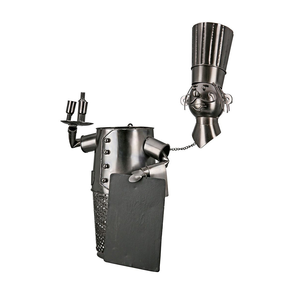 Här har du en unik flaskhållare som ger en lite personligare servering. Denna hållare i polerad metall är formad som en kock, med plats för en flaska inuti. Kockmössan är avtagbar för enkel åtkomst, och på den medföljande griffeltavlan kan du skriva dryckens namn eller ett kort meddelande. En gedigen och välgjord detalj som blir ett naturligt blickfång på bordet – perfekt för den som vill presentera drycken med en humoristisk twist.