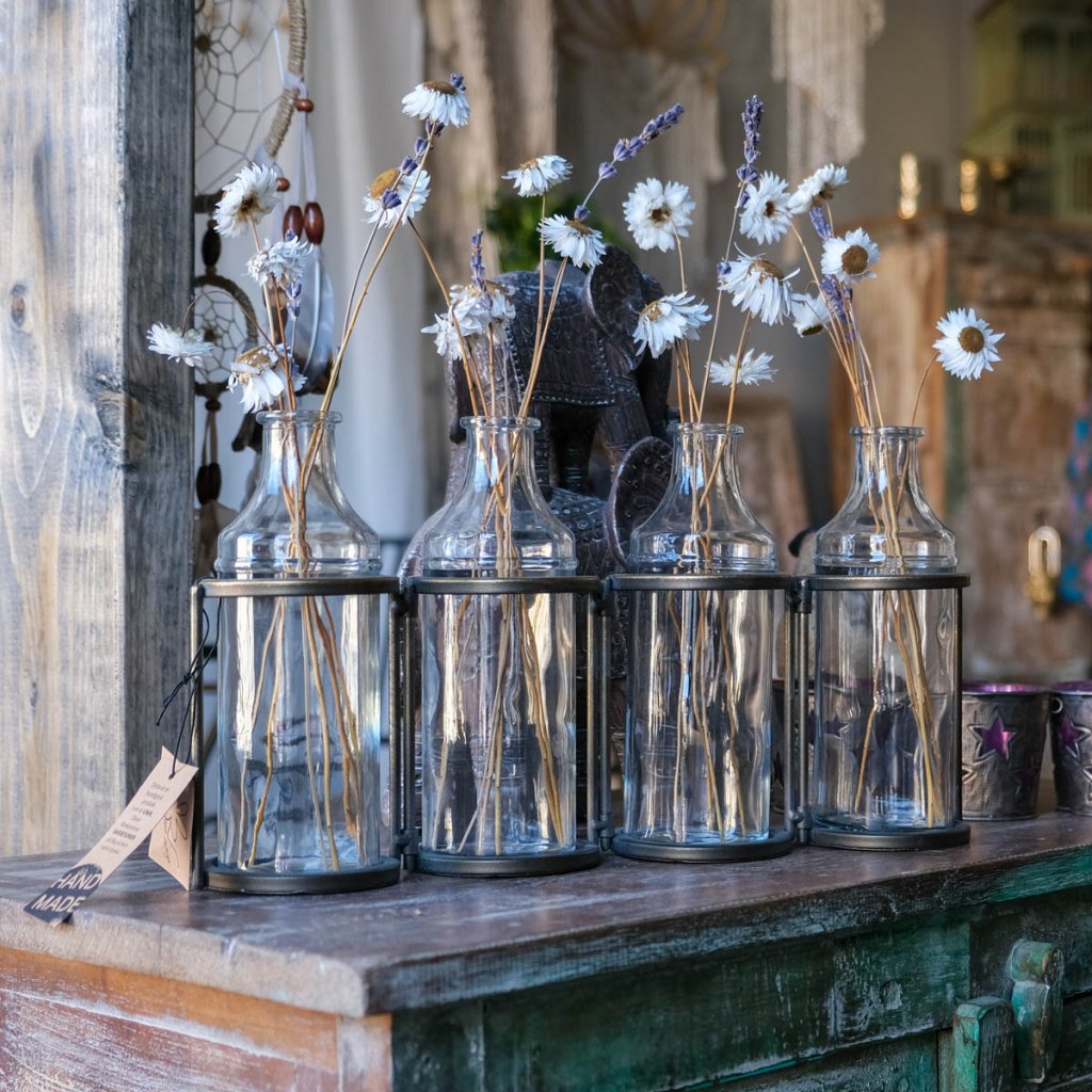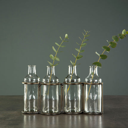 Ställning med fyra glasflaskor. Jättemysig att dekorera bordet med tillsammans med växter och varför inte små kronljus?