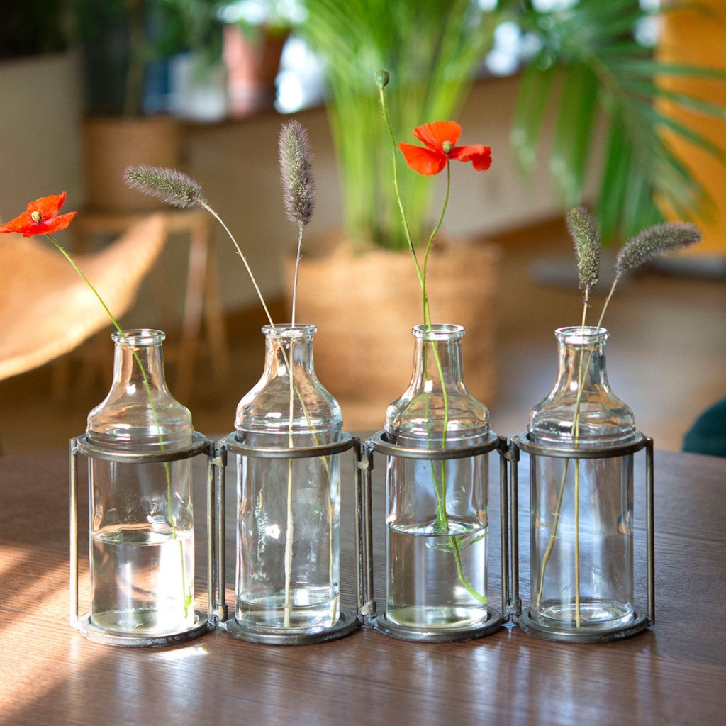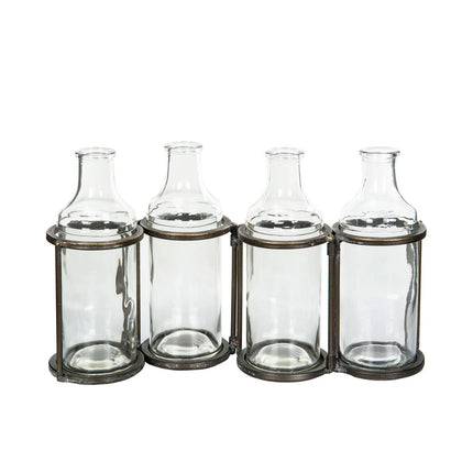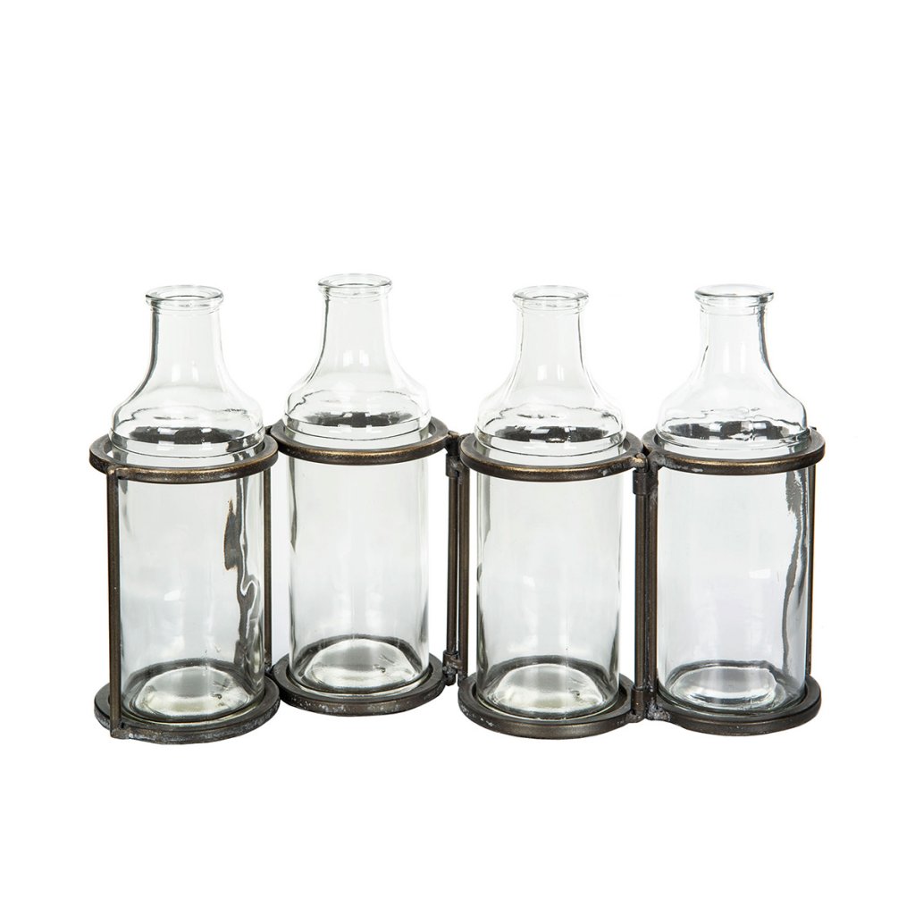 Fyra glasflaskor i ställning