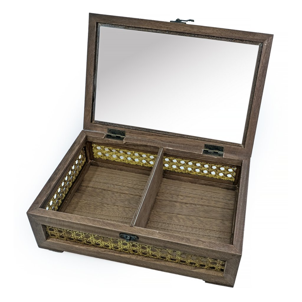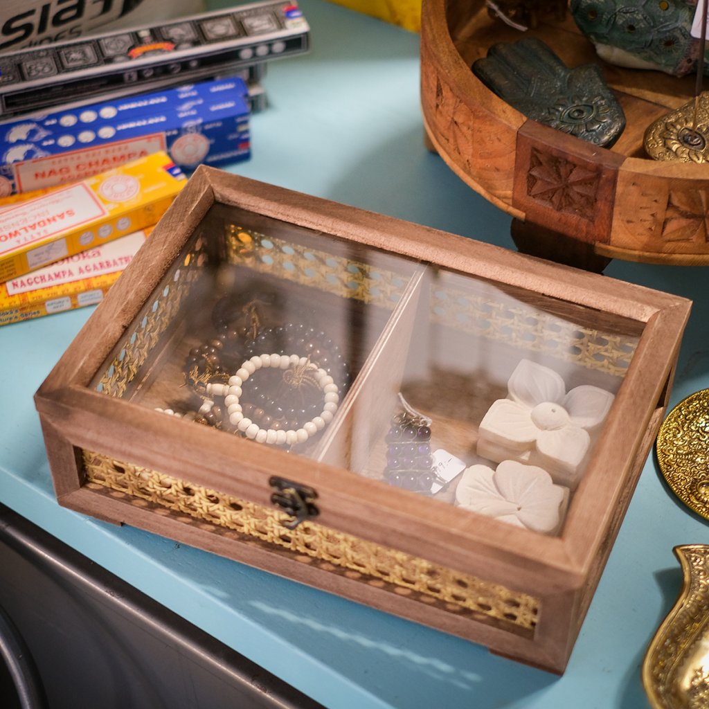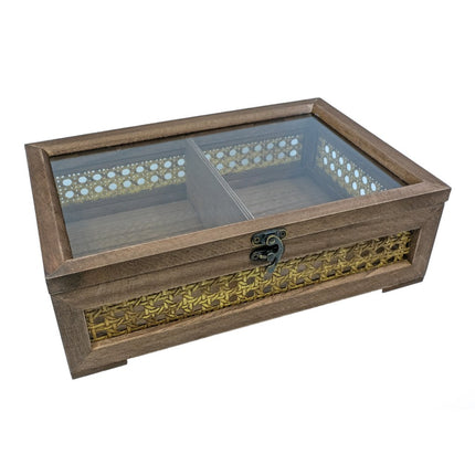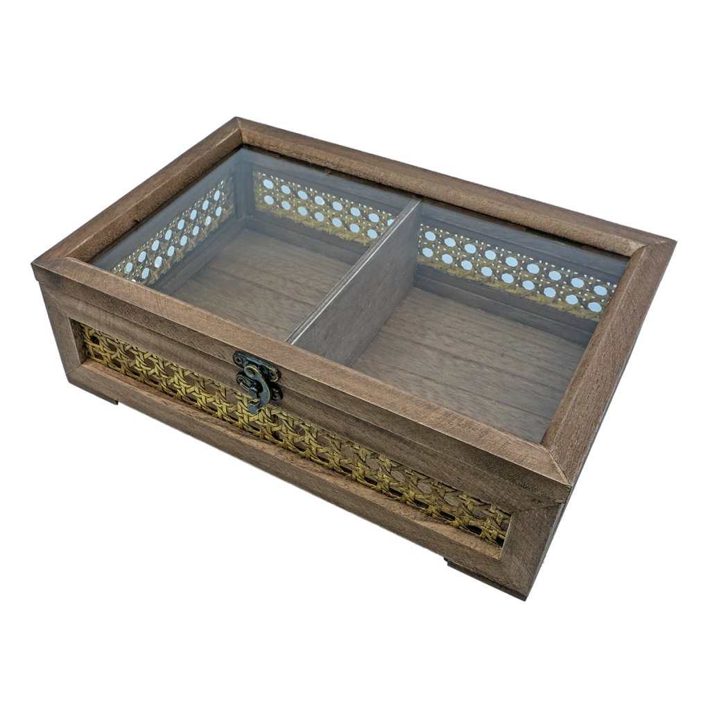 En vacker och stilfull trälåda med detaljer i rotting och ett lock av glas som ger en tydlig inblick i innehållet. Perfekt för att förvara smycken, klockor, håraccessoarer eller andra små favoriter du vill ha nära till hands.