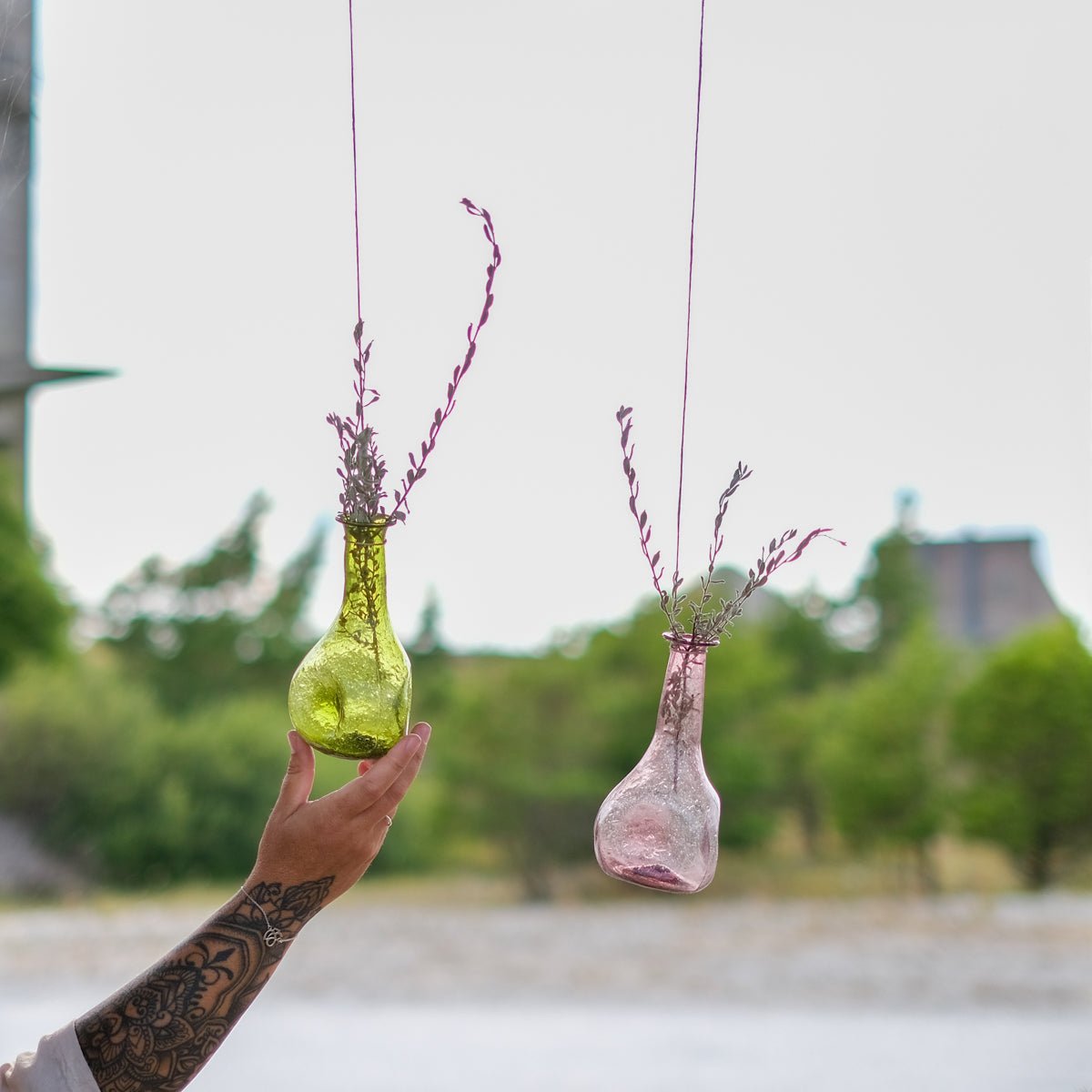 Underbara små glasvaser. Unikt formgivna. Glasvaserna är lika fina stående, men kan med fördel hängas i lite hampatråd.
