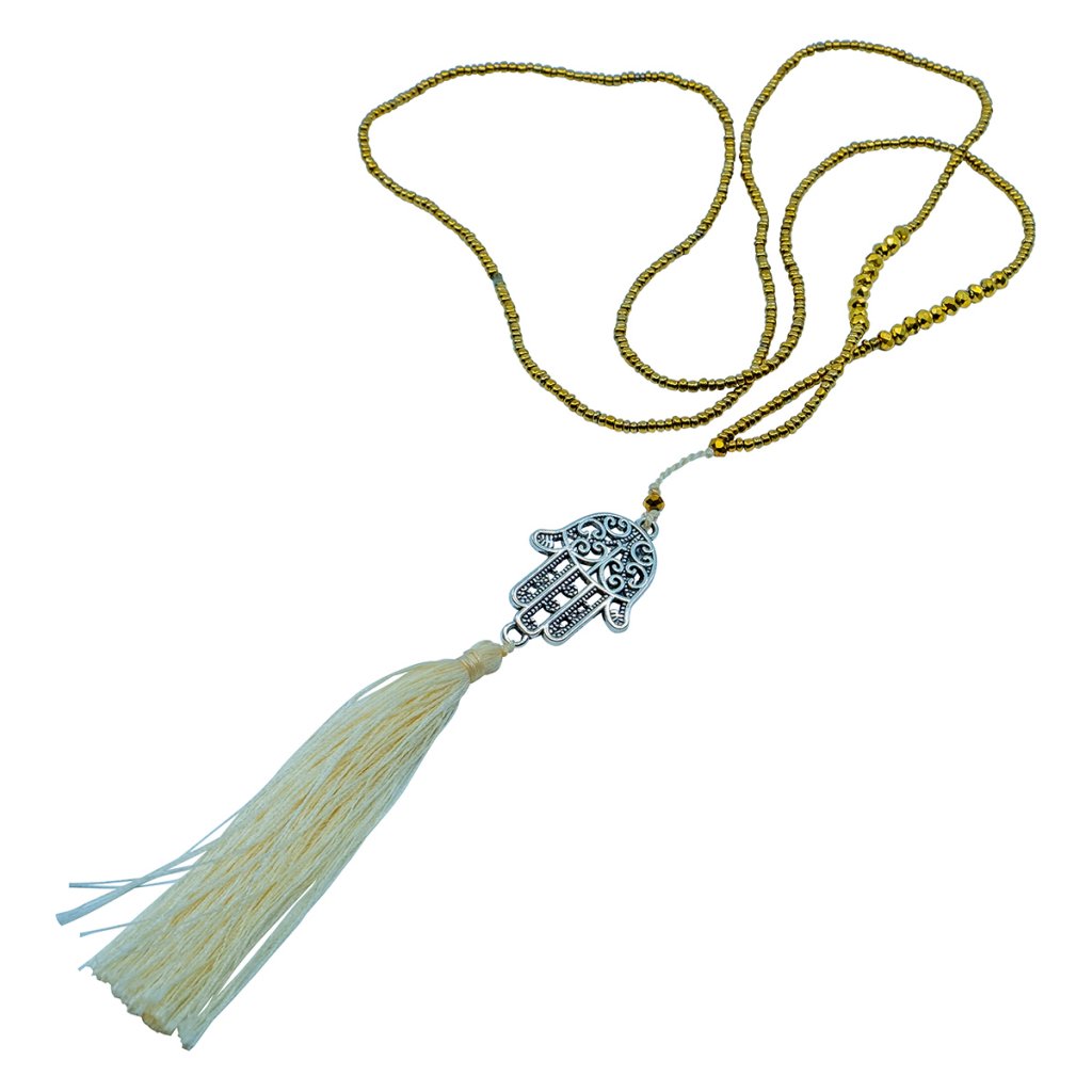 Halsbandet är ca 40 cm långt, med sin tofs och fina pärlor i guld.