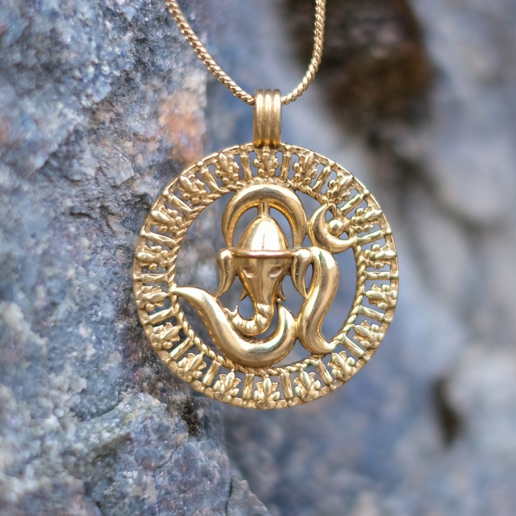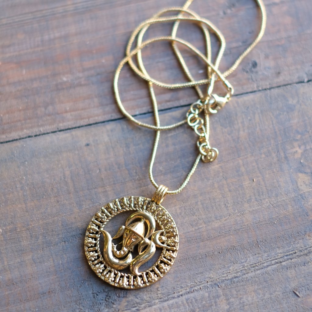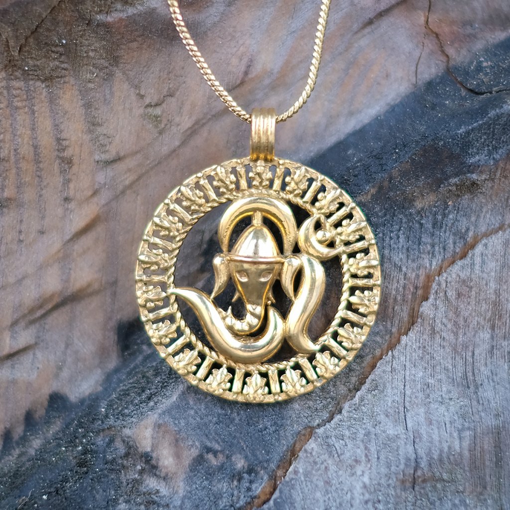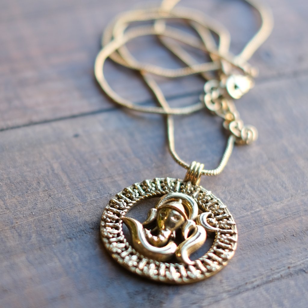 Vackert halsband i brons med ett hänge som föreställer guden Ganesha. Smycket är handgjort i Indien. Ganesha är en av hinduismens mest populära gudar och är känd som visdomens och framgångens gud.