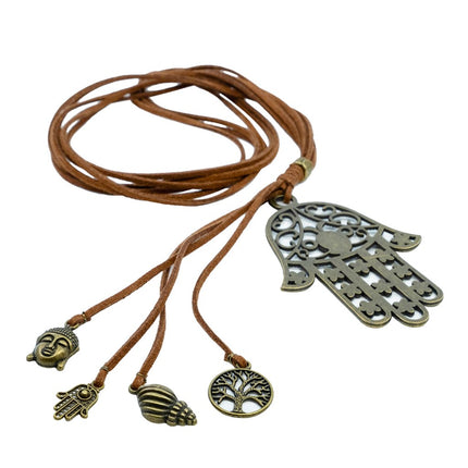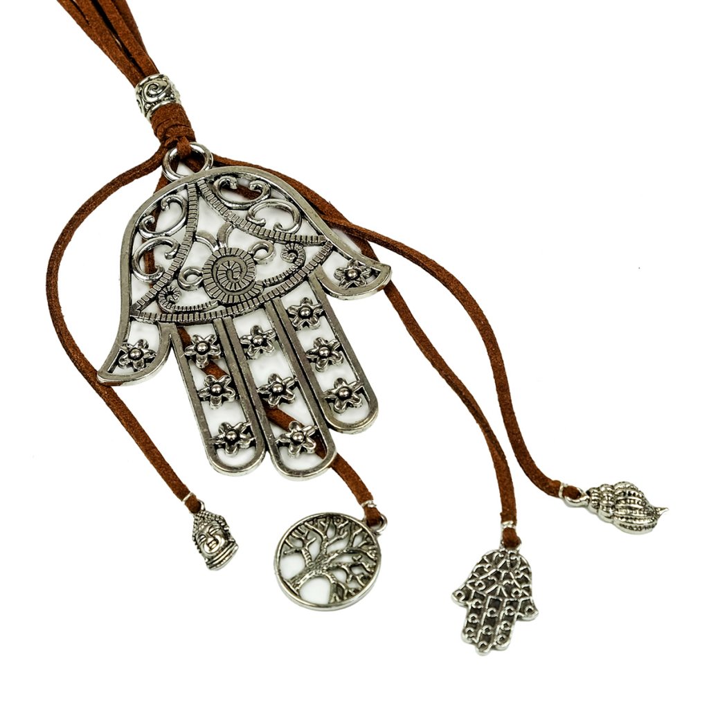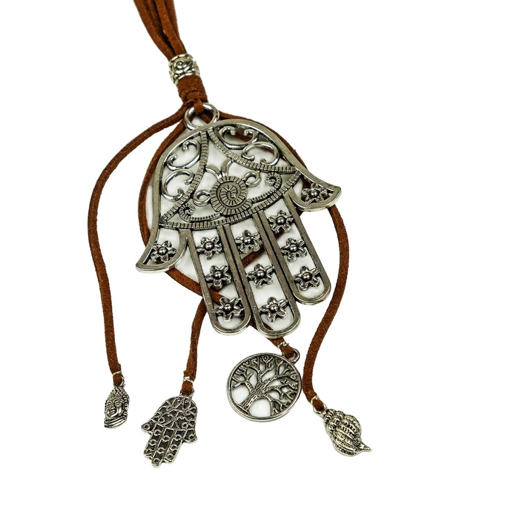 Halsband med Fatimas hand, buddha-huvud och andra symboler.