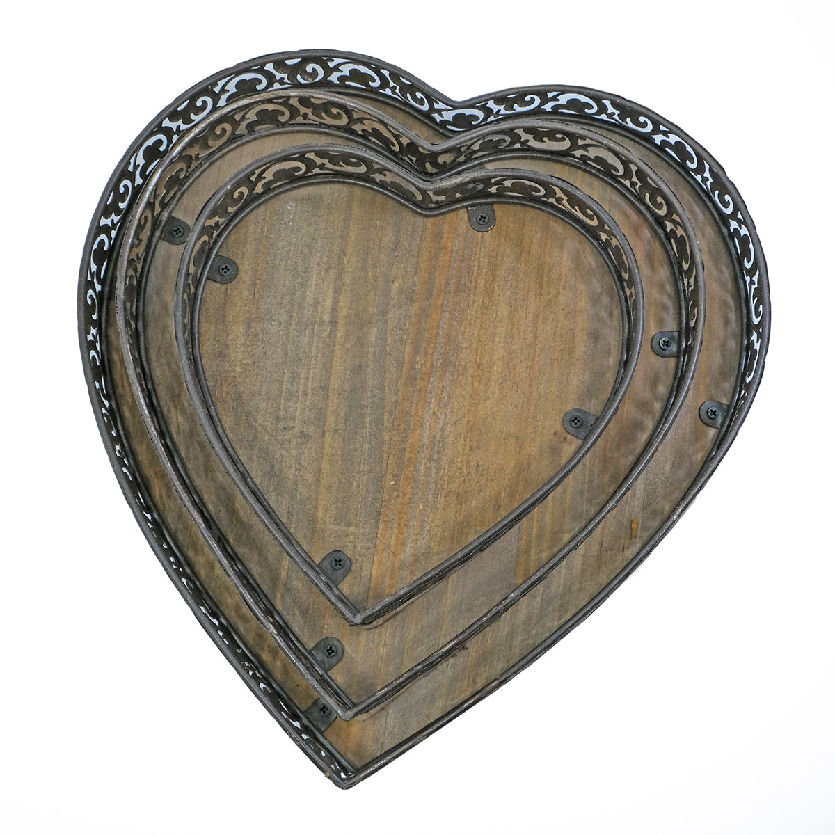 Charmiga brickor i form av hjärtan, tillverkade i trä med en dekorativ metallkant i rustik stil.