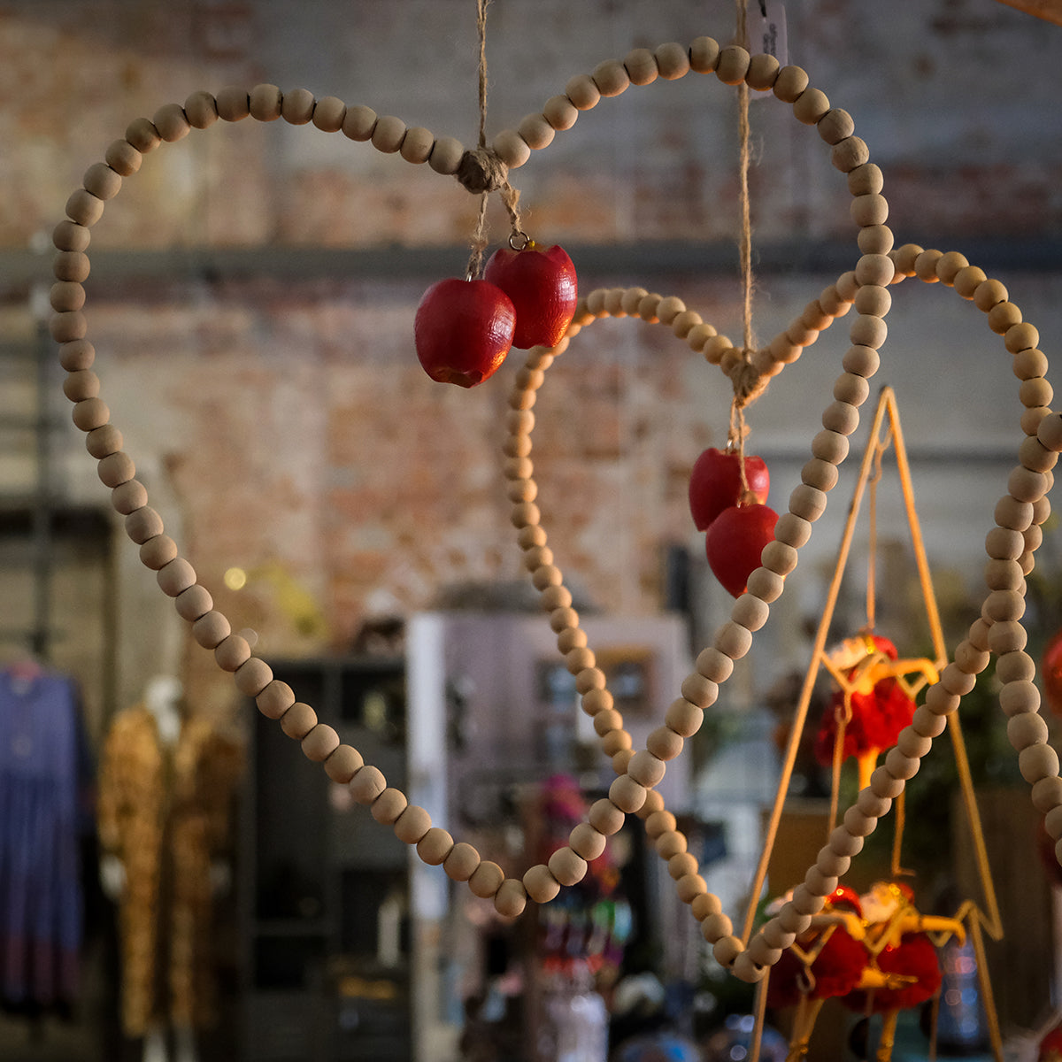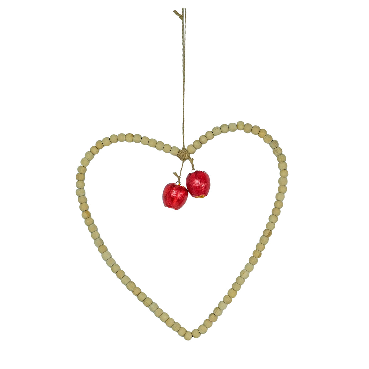 Ett vackert hjärta av träkulor med två små röda äpplen som pricken över i.