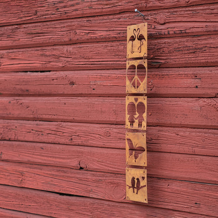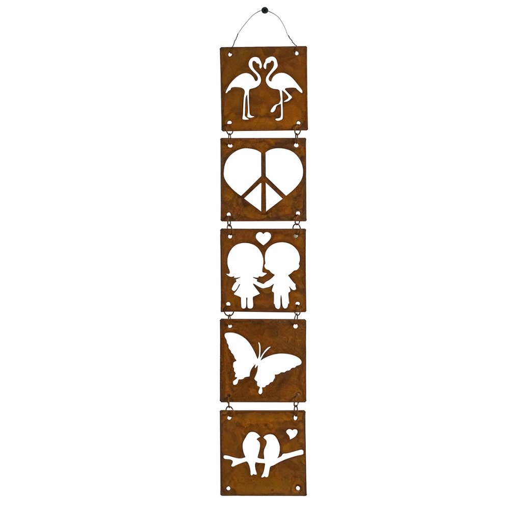 Varje fyrkant i hänget är 10x10 cm stor och ordningsföljden är flamingo, love & peace, barn, fjäril och fåglar.