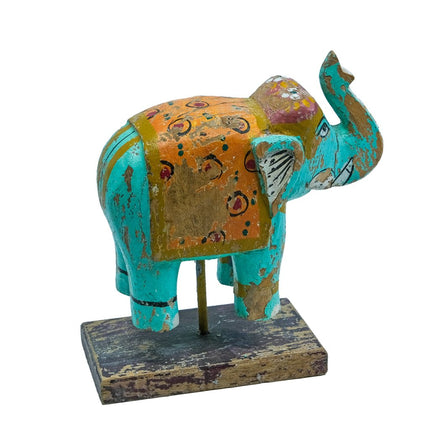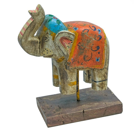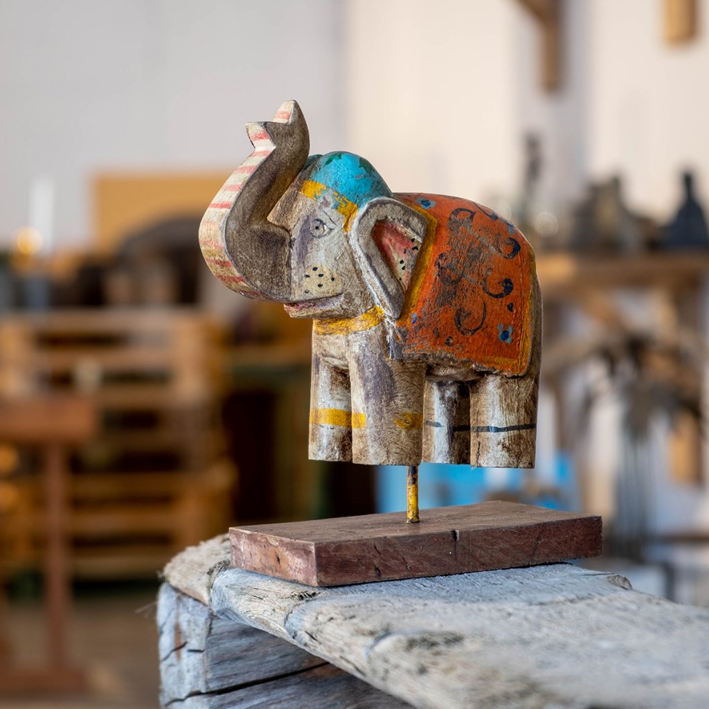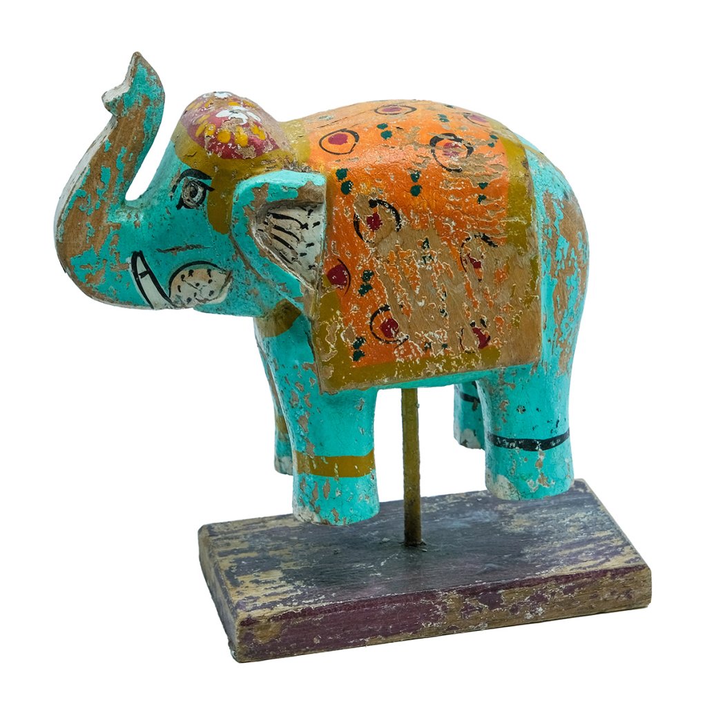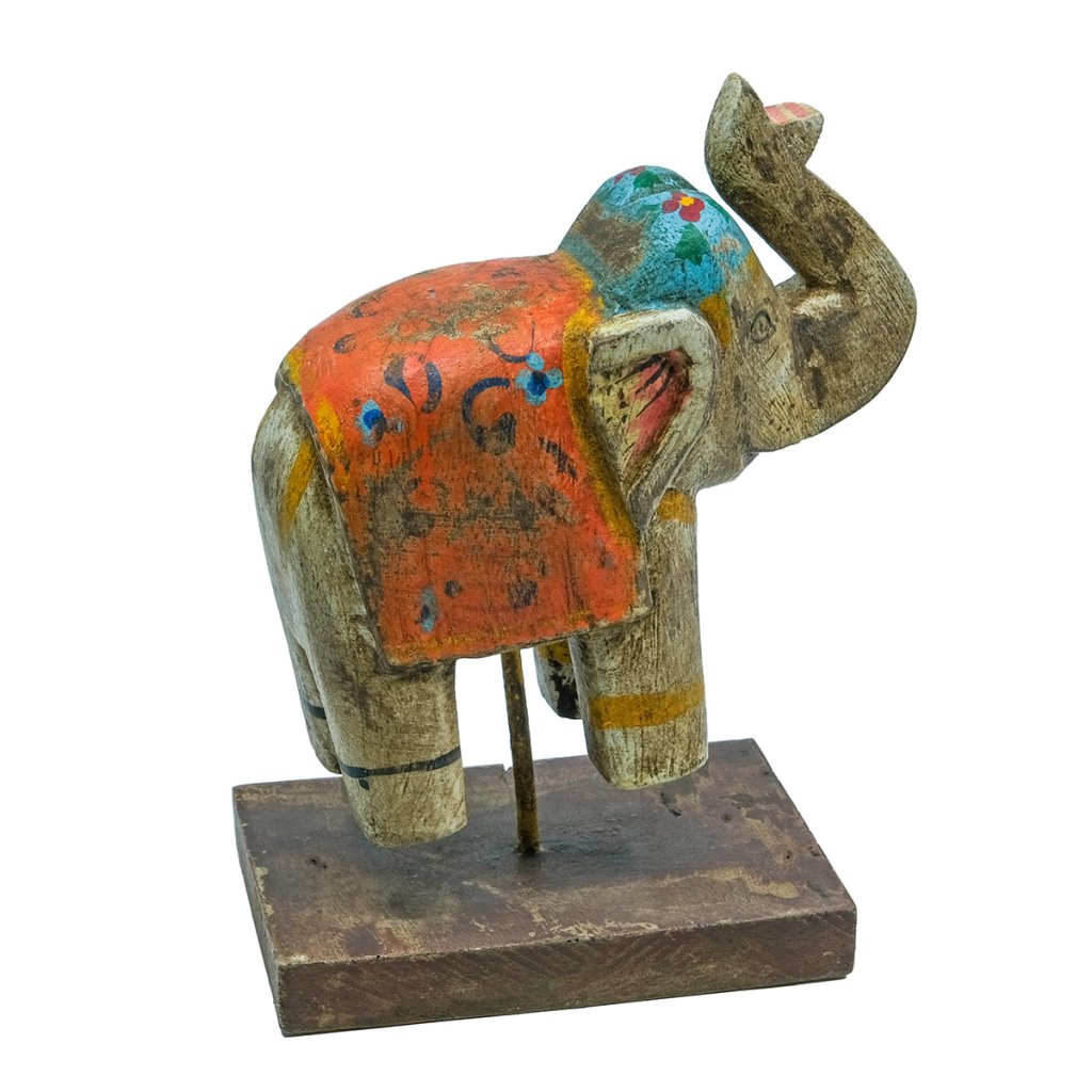 Charmig och färgglad träelefant på pinne med platta. Färger och patina varierar.