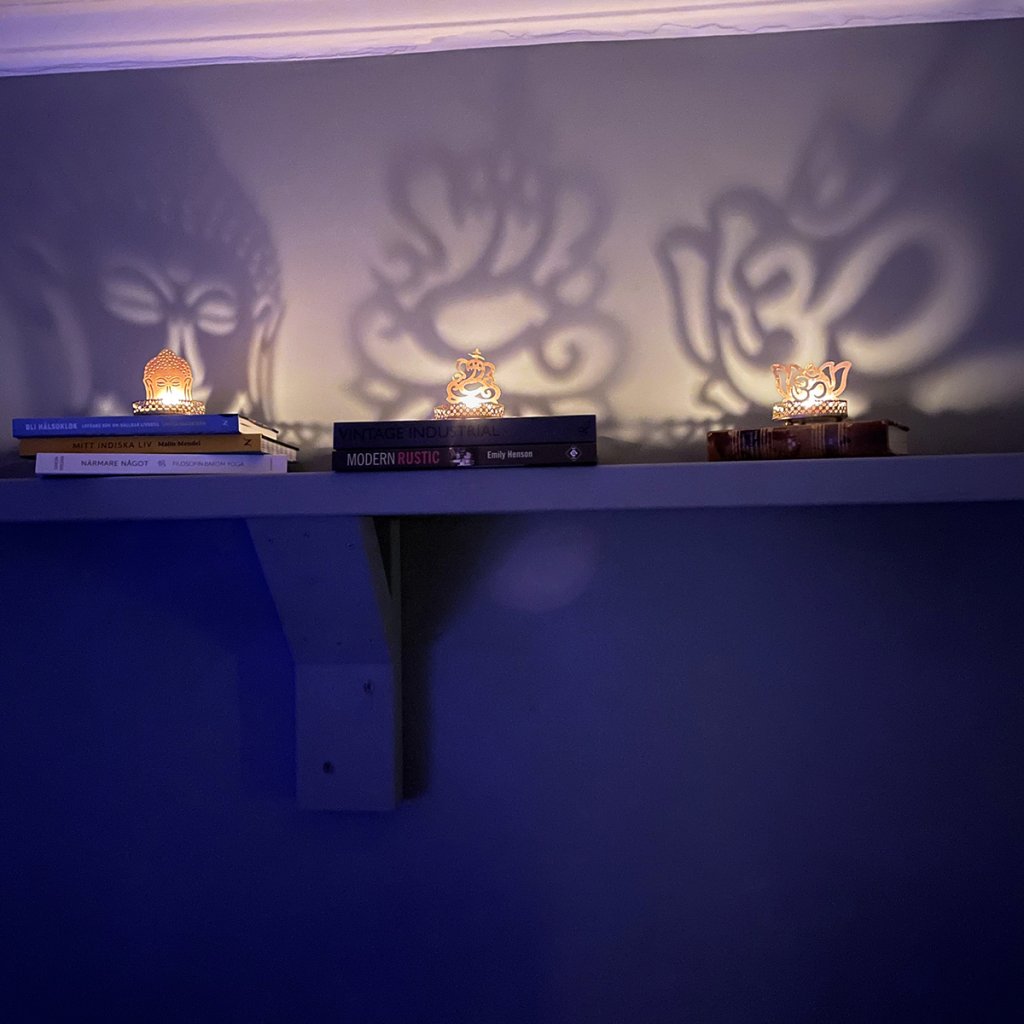 Små enkla indiska värmeljushållare som beroende på mörker och avstånd från vägg kastar fantastiska skuggor.