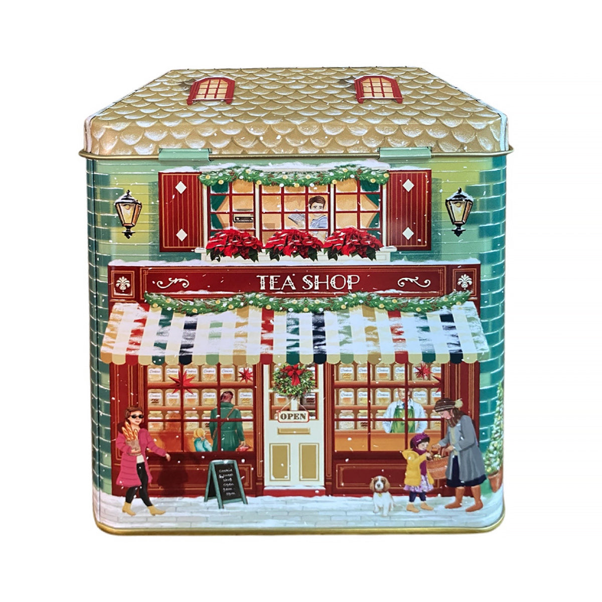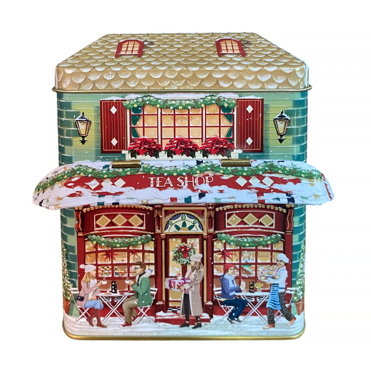 En riktigt charmig jul-burk i form av en liten butik - komplett med tak som lock och en utfällbar markis. Detaljerna gör att burken känns som ett litet miniatyrhus, och den blir lika mycket dekoration som praktisk förvaring. Perfekt för julens kakor, godis eller tepåsar - eller bara för att sprida lite extra stämning på hyllan.