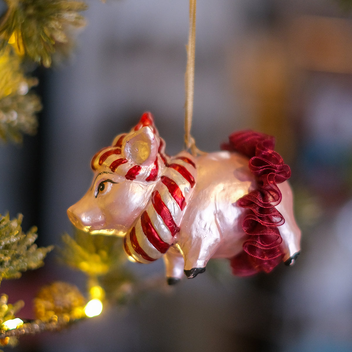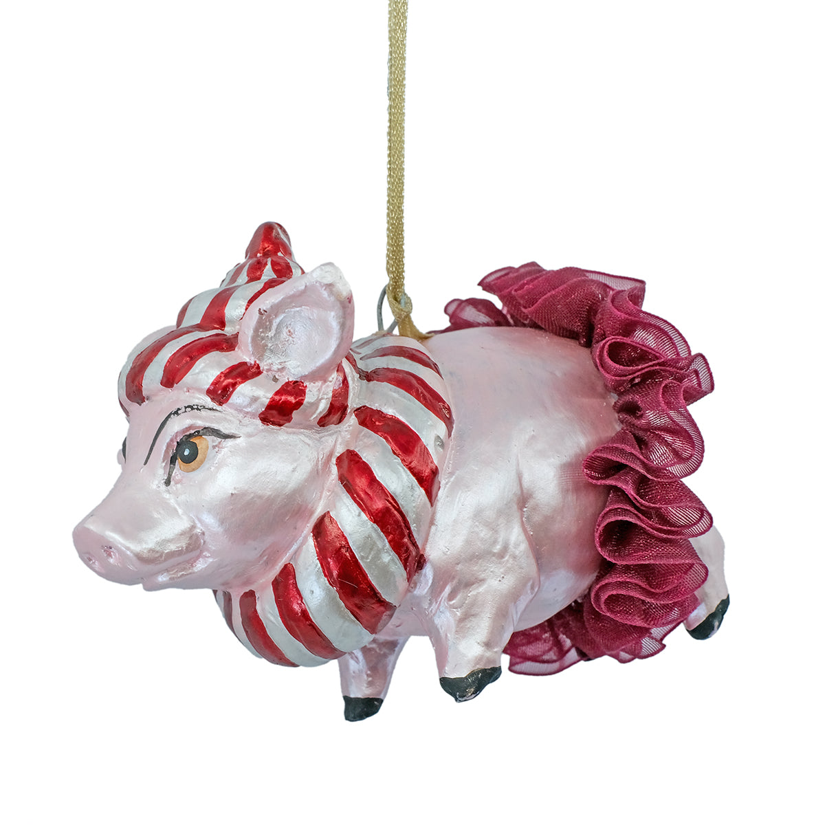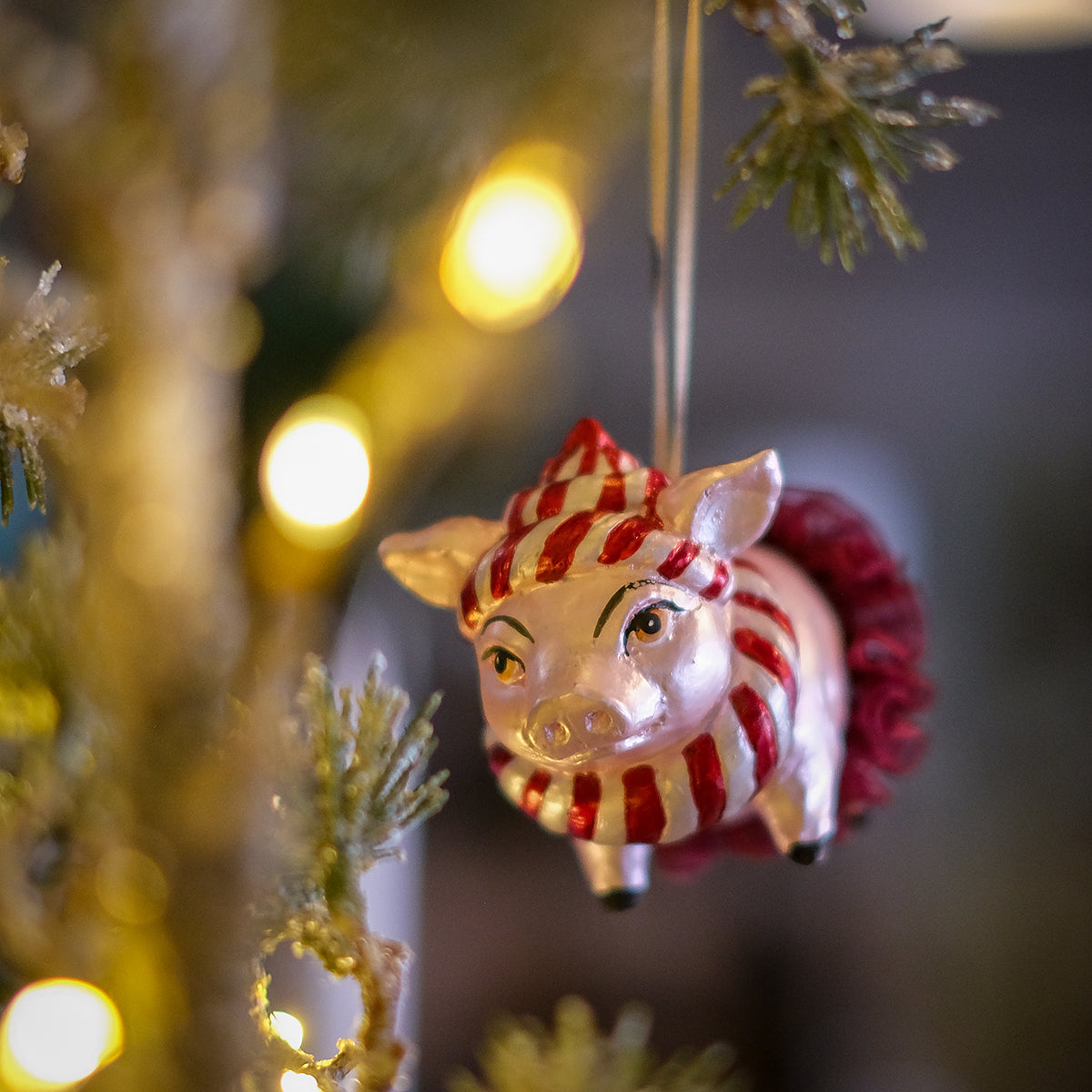 Julgranen får garanterat en extra dos humor med detta julgranshänge i form av en gris med polkagrisrandig frisyr och volangkjol. Hon ser mer redo ut för balett än julbord - men det är just det som gör henne till ett hänge som sticker ut och sprider leenden. Ett perfekt julgranshänge för dig som vill ha pynt med både humor och hjärta.