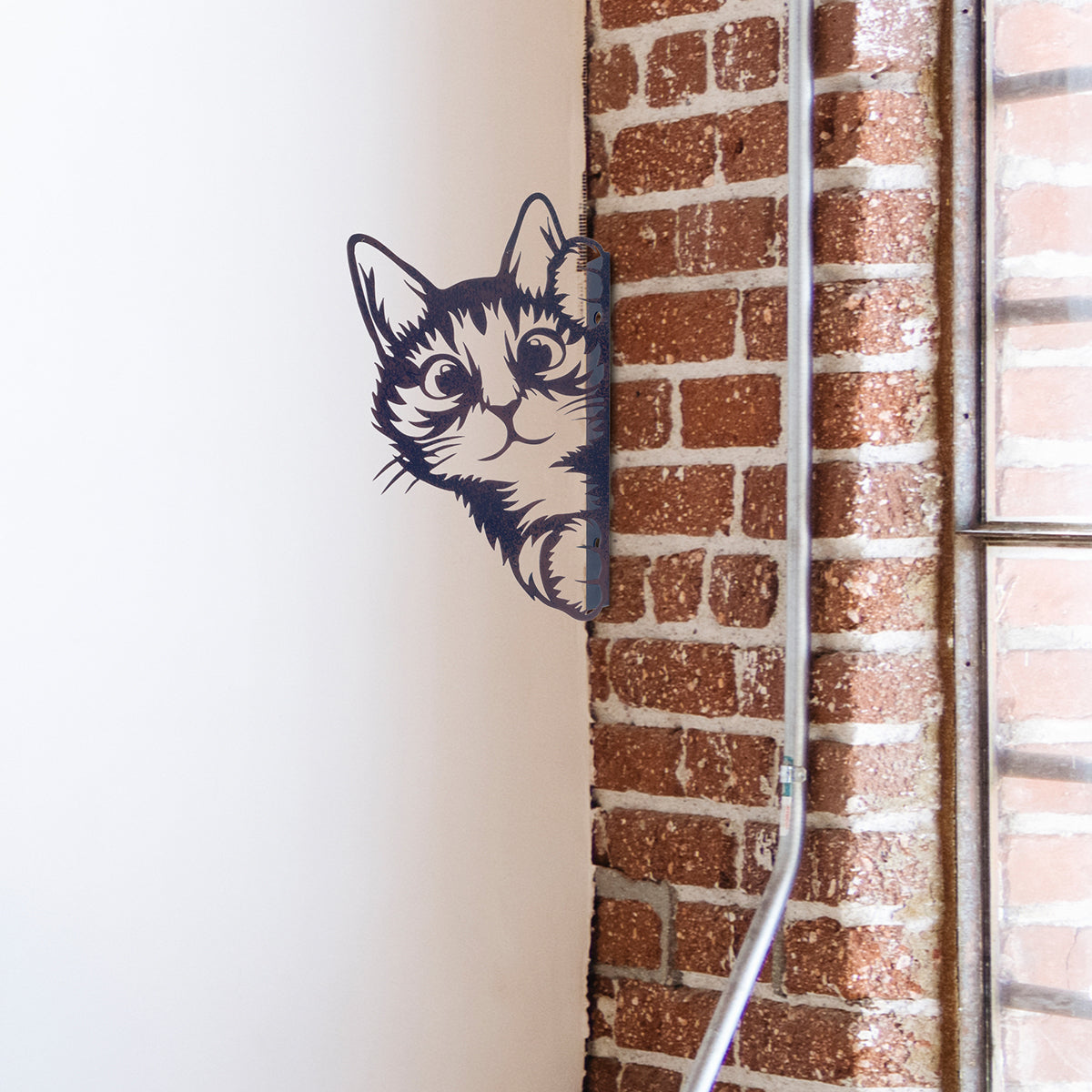 En lekfull väggdekoration i metall där katten nyfiket kikar fram runt hörnet. Den stilrena siluetten ger ett charmigt och humoristiskt uttryck i ditt hem.