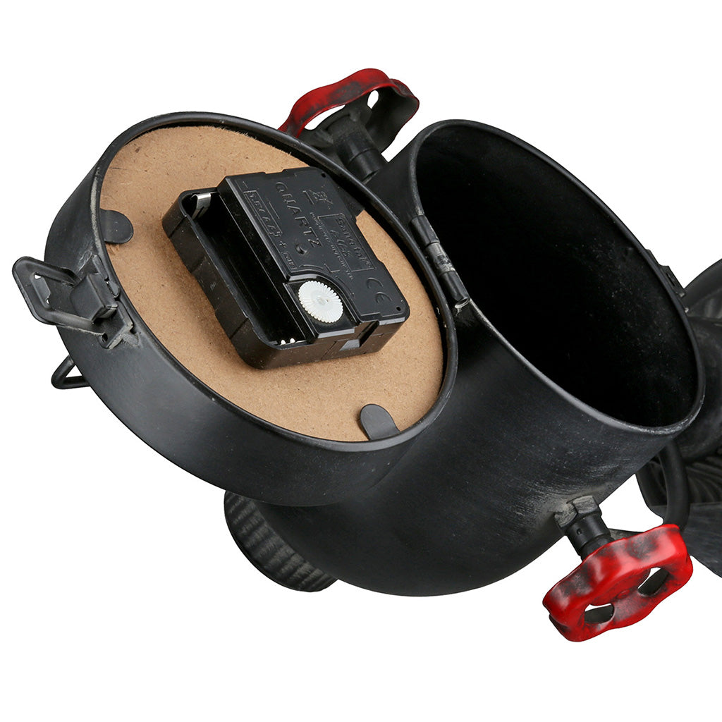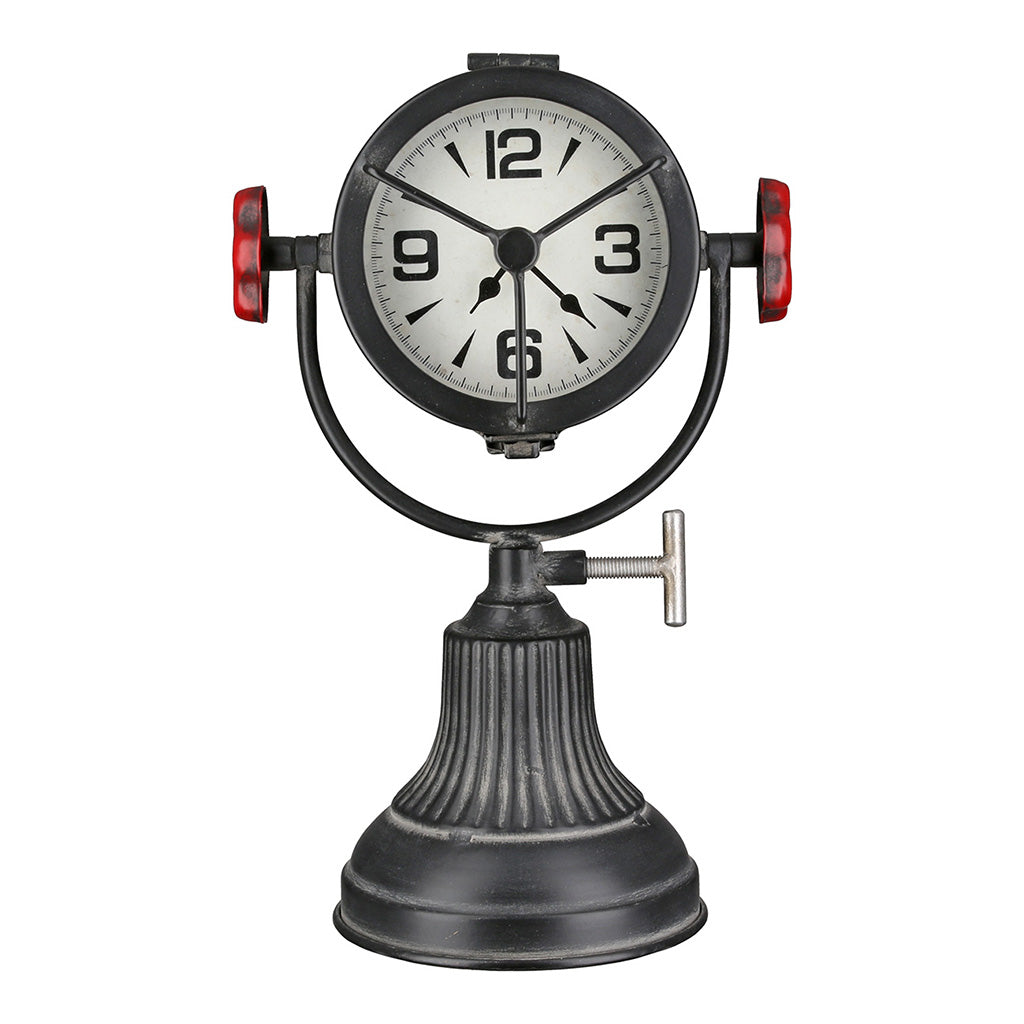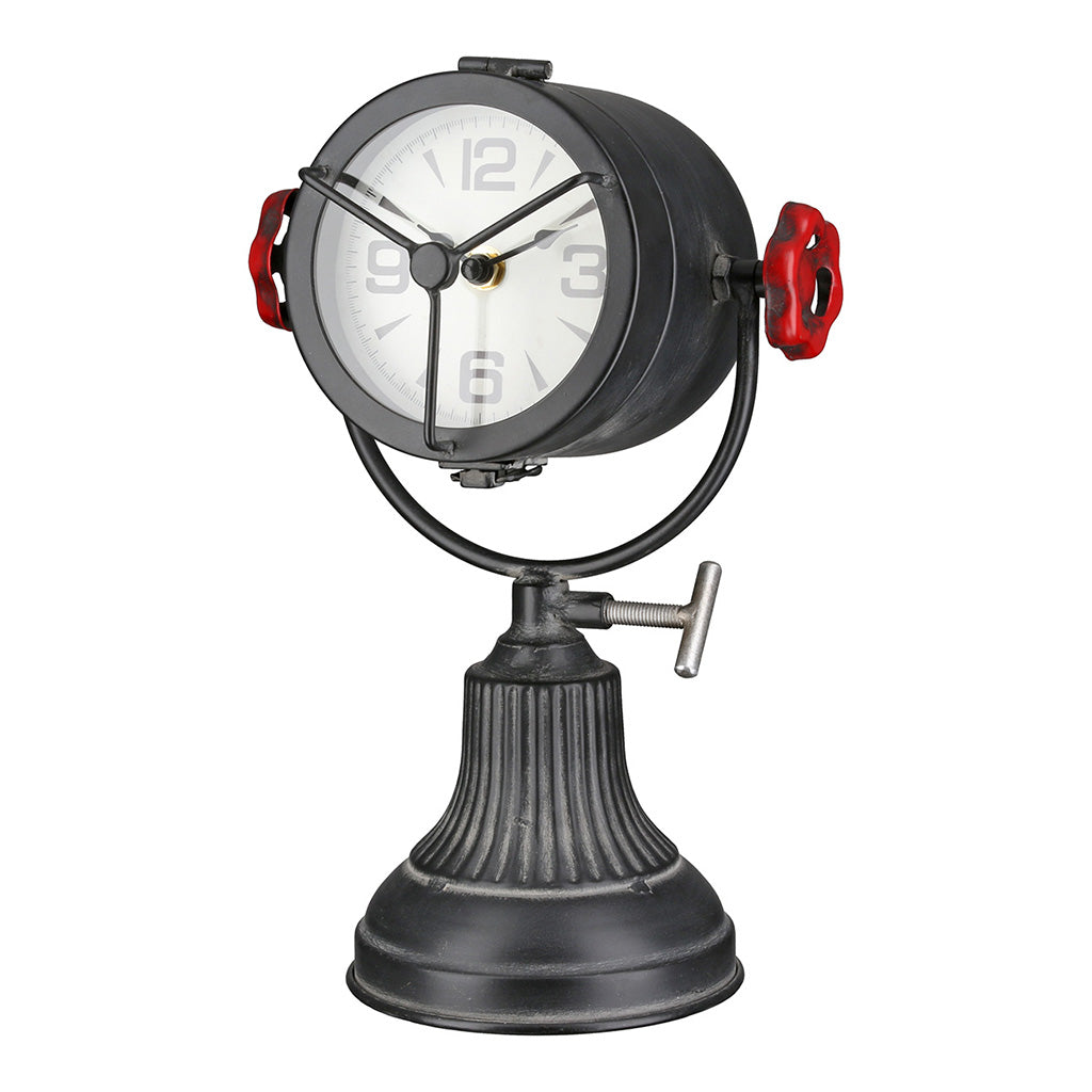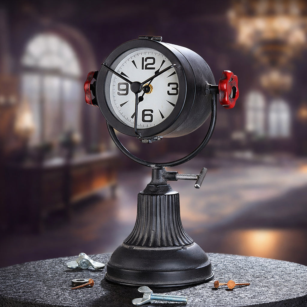 En bordsklocka i metall med tydliga industriella detaljer. Formen påminner om äldre verkstadslampor och mätinstrument, med en klassisk och lättläst urtavla.