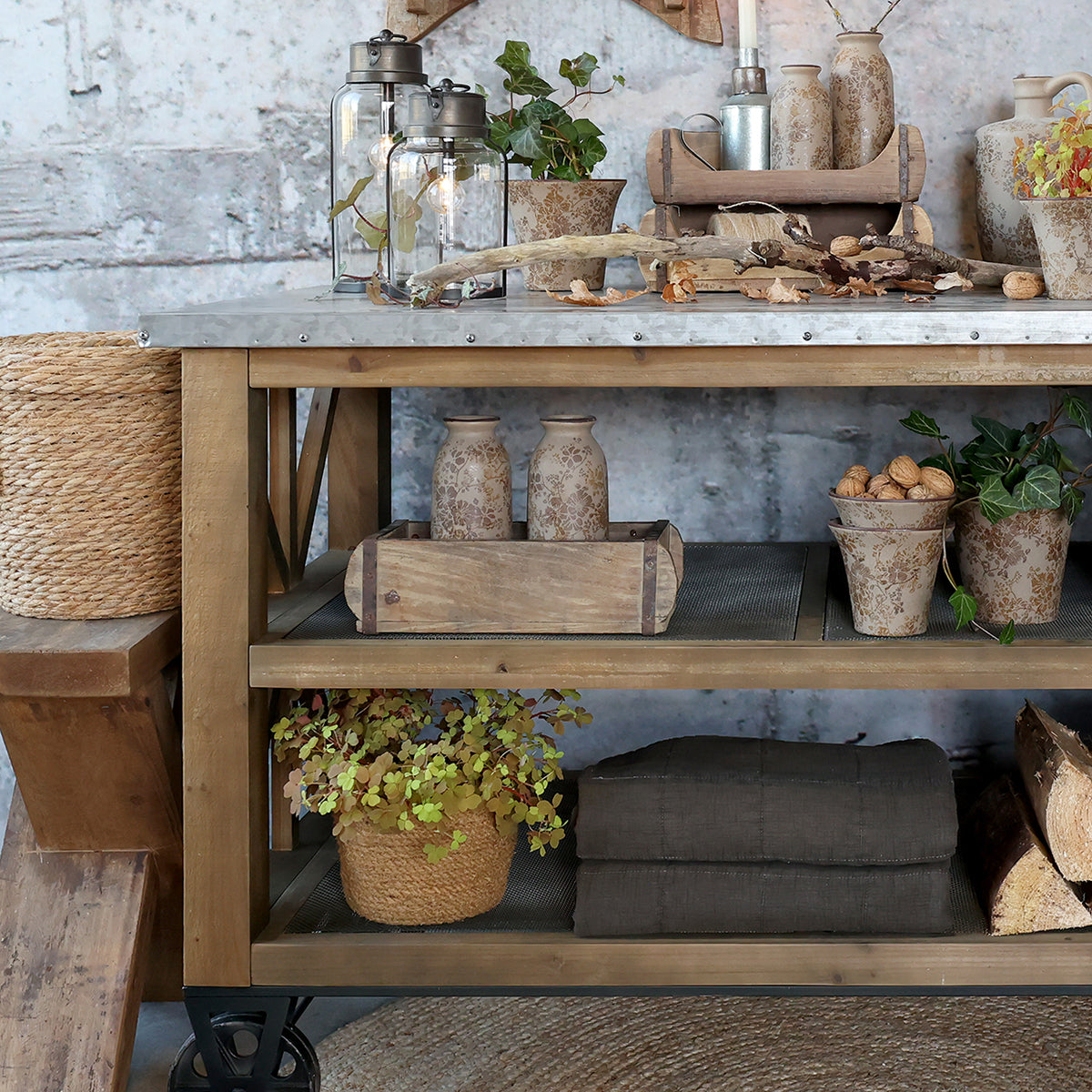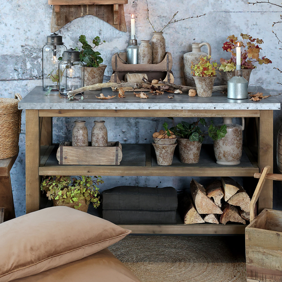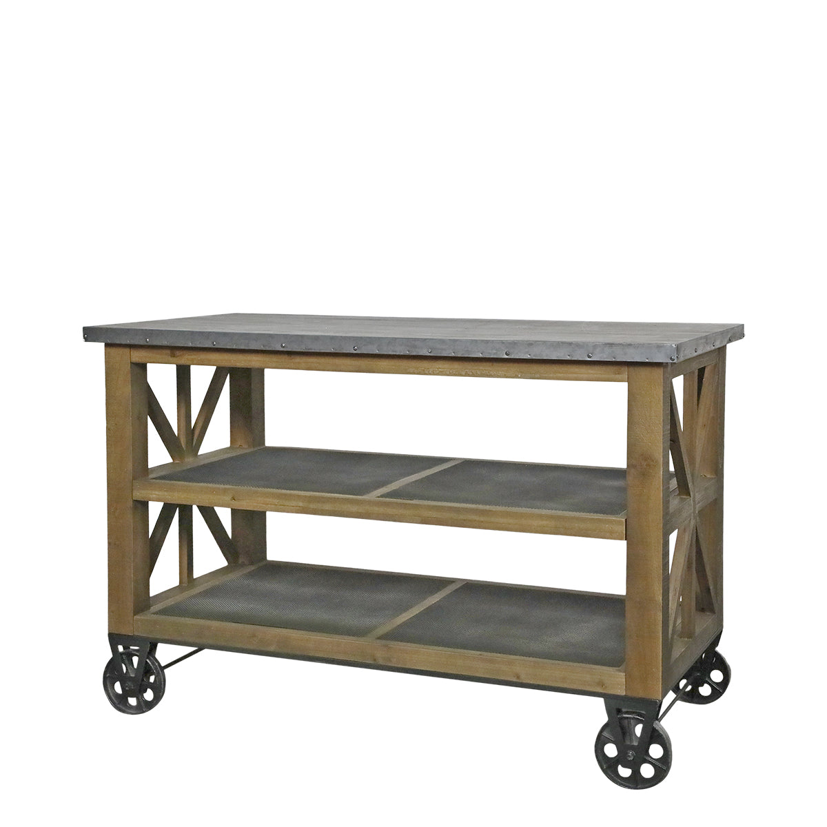 Den här köksön är redo att rulla in och ta plats - både stilmässigt och praktiskt. Med en rejäl skiva i zink och stabil stomme i granträ har den både industriell charm och gedigen känsla. Hyllplanen i metallnät gör den perfekt för förvaring av allt från kokböcker till kastruller, eller varför inte en samling snygga burkar?