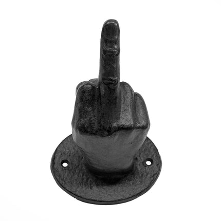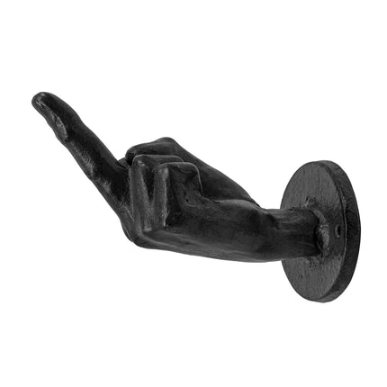 En väggkrok i svart gjutjärn som inte ber om ursäkt. Formad som en hand med långfingret i vädret är det här en krok med attityd, integritet - och en rejäl dos humor. Den bär upp jackor, väskor eller hörlurar med exakt samma självsäkerhet som den signalerar till omvärlden. En oväntad detalj som garanterat väcker reaktioner oavsett om du sätter den i hallen, garaget eller på kontoret.