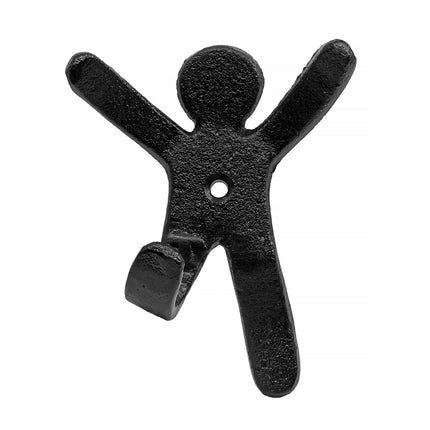 En charmig väggkrok i svart gjutjärn, formad som en liten figur med armarna i luften - som om den firade att få vara en del av din inredning! Det böjda benet fungerar som en stadig krok, men även armarna kan användas för att hänga upp jackor, handdukar, smycken eller bara sprida lite glädje i hallen, badrummet eller barnrummet. En krok som gör vardagen roligare helt enkelt!