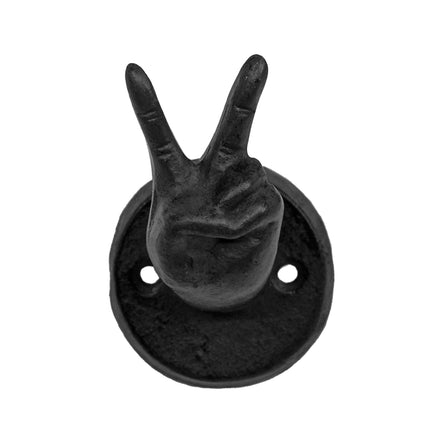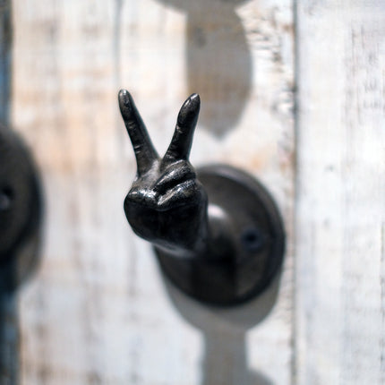 En tuff och uttrycksfull väggkrok i svart gjutjärn, formad som en hand som gör peace-tecknet (eller V för victory). En krok som vågar ta plats och sprida både stil och budskap.