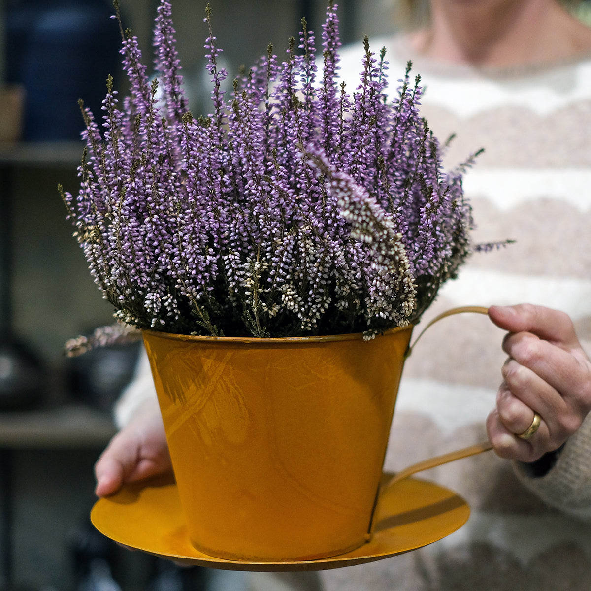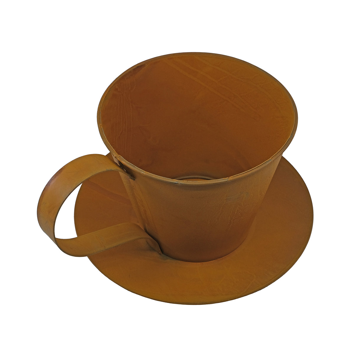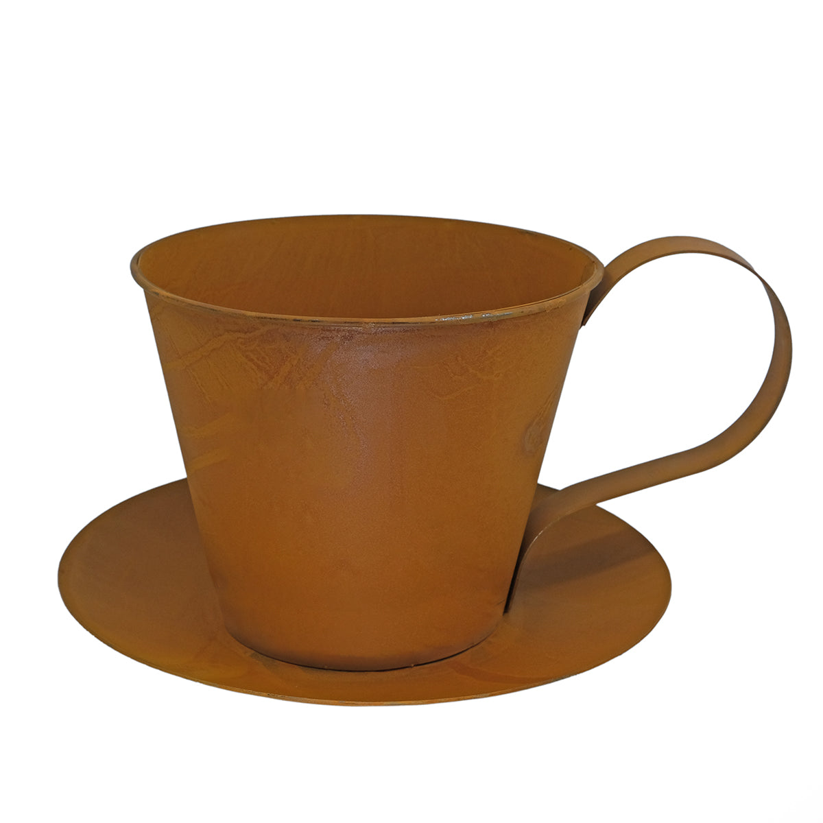 Utformad som en stor kaffekopp på fat med rostig finish som ger den ett originellt uttryck. Perfekt för blommor, kryddor eller som en annorlunda inredningsdetalj bara.