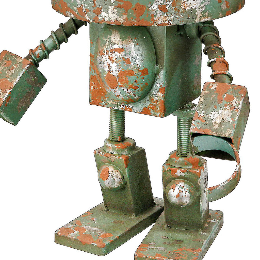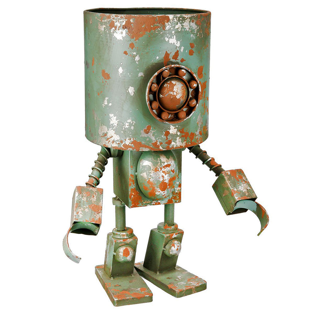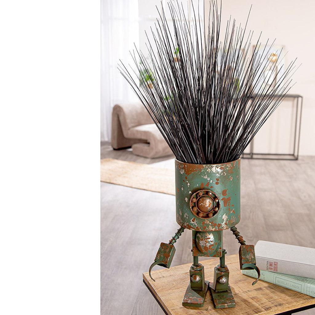 Charmigt rostig och full av karaktär! Den här stora robotkrukan är ett riktigt blickfång med sin patinerade gröna yta, runda ögon och kraftiga klor till händer. Den är tillverkad av återvunnen metall, vilket ger varje exemplar en unik känsla.