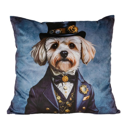 Med sin blå rock, hatt och steampunk-accessoarer är den här fluffiga kompisen redo för tebjudning – eller soffmys. Ett kuddfodral för dig som vill ha färg, karaktär och ett gott skratt i vardagsrummet.