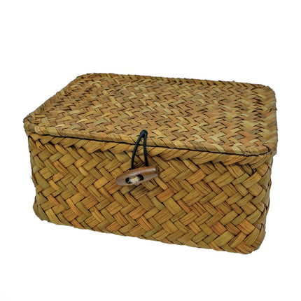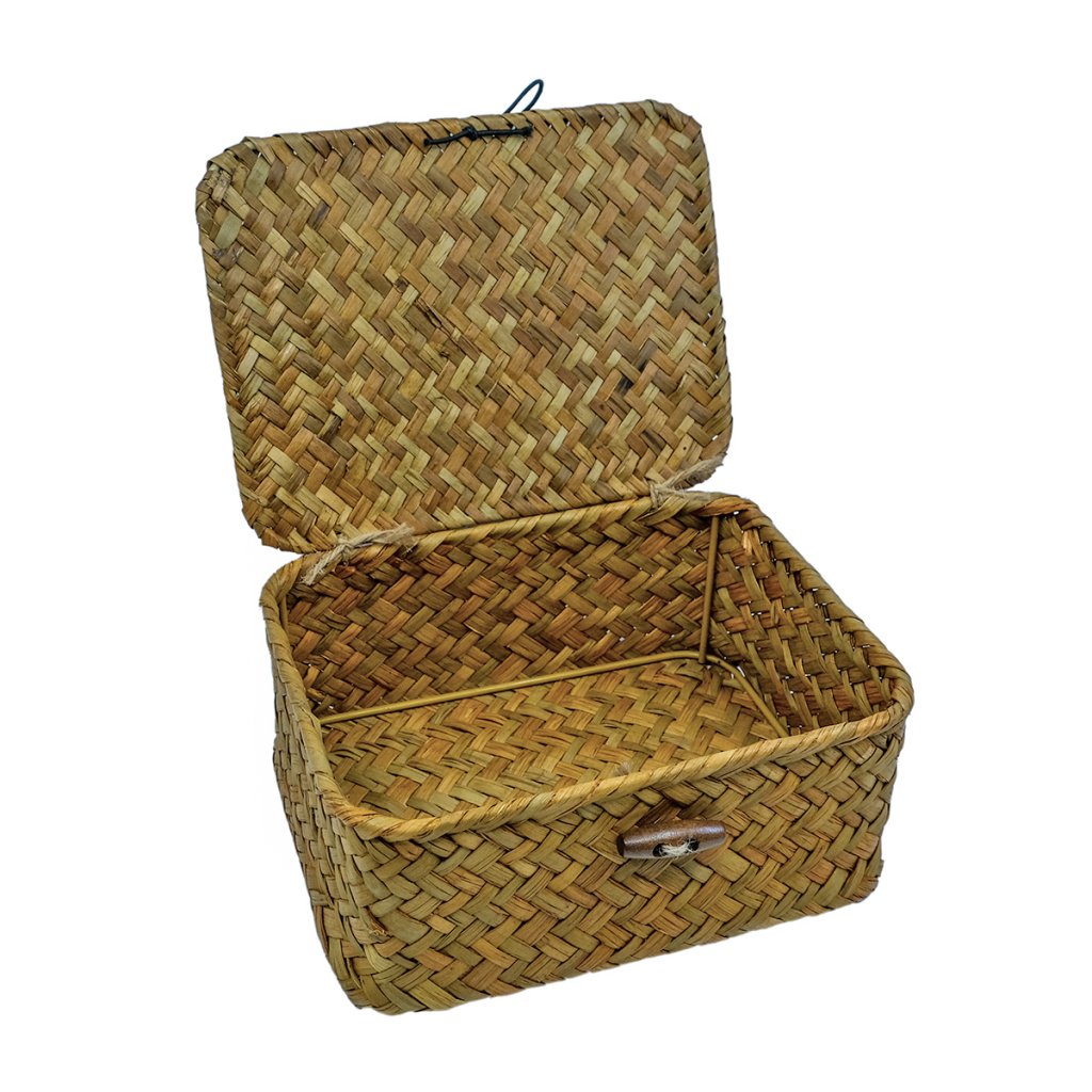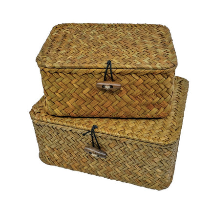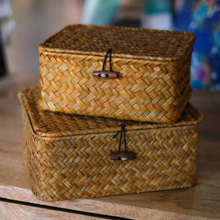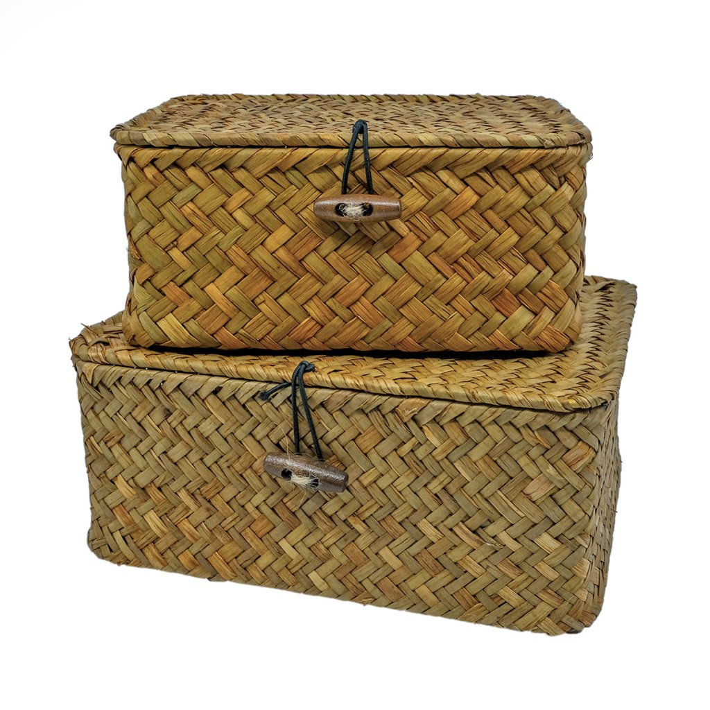 Våra superfina förvaringslådor i flätat sjögräs är både praktiska och dekorativa. De kommer i två storlekar och är handgjorda av torkat sjögräs och andra naturmaterial, vilket gör varje låda unik. Den vackra flätade strukturen och det charmiga träspännet på framsidan ger en naturlig och jordnära känsla till ditt hem.