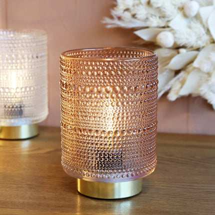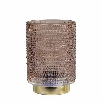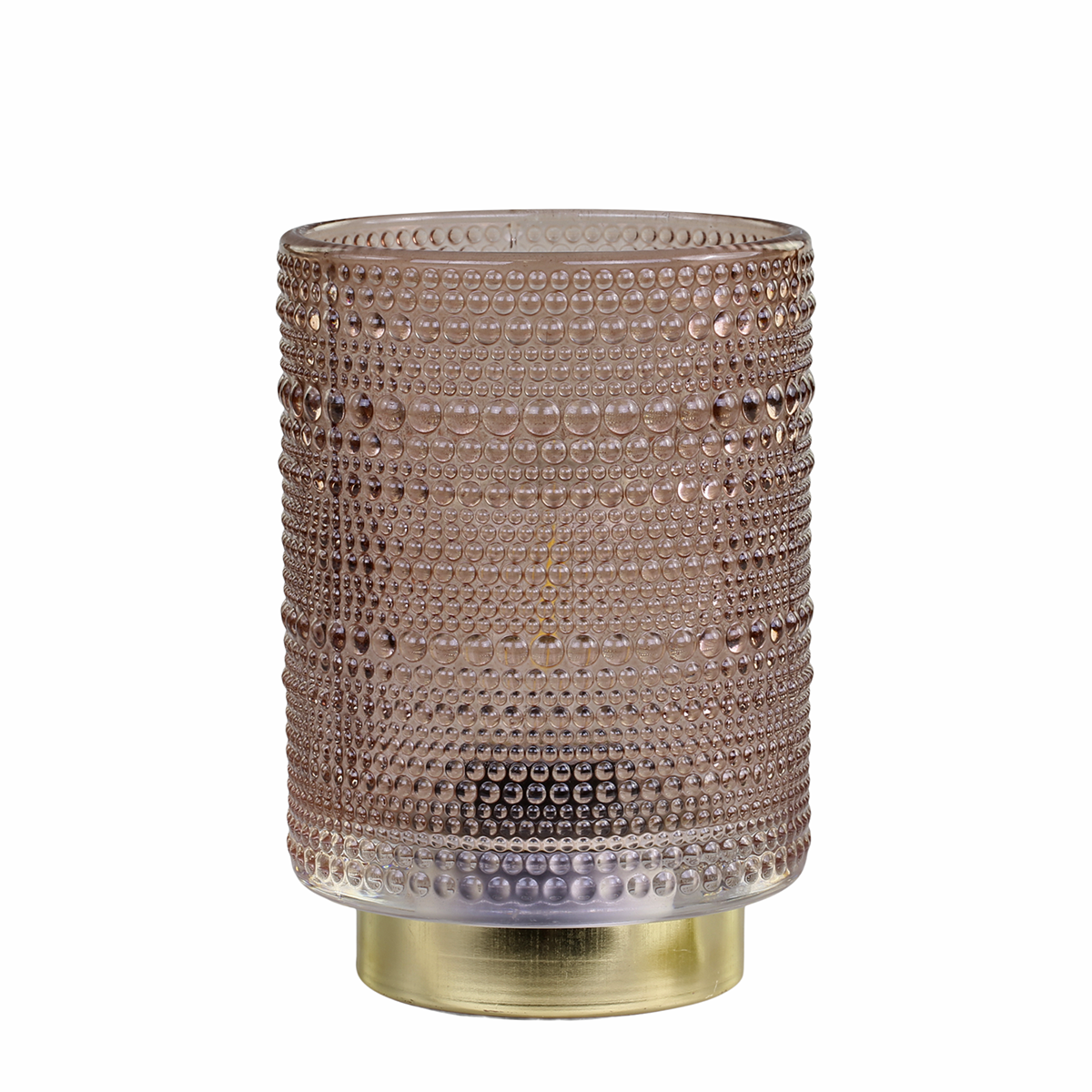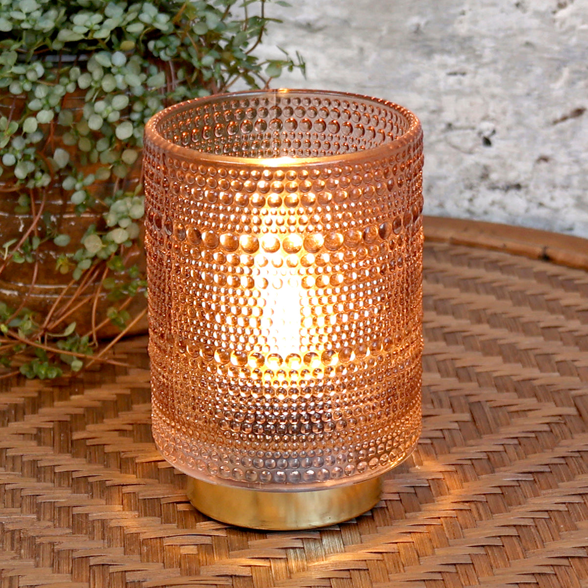 En liten men stämningsfull ljuslykta i ärgat glas med pärlstruktur som påminner om daggdroppar. Den varma LED-glödlampan ger ett mjukt sken som skapar mys utan öppen låga - perfekt för barnfamiljer, hyllor eller fönster där levande ljus inte passar.
