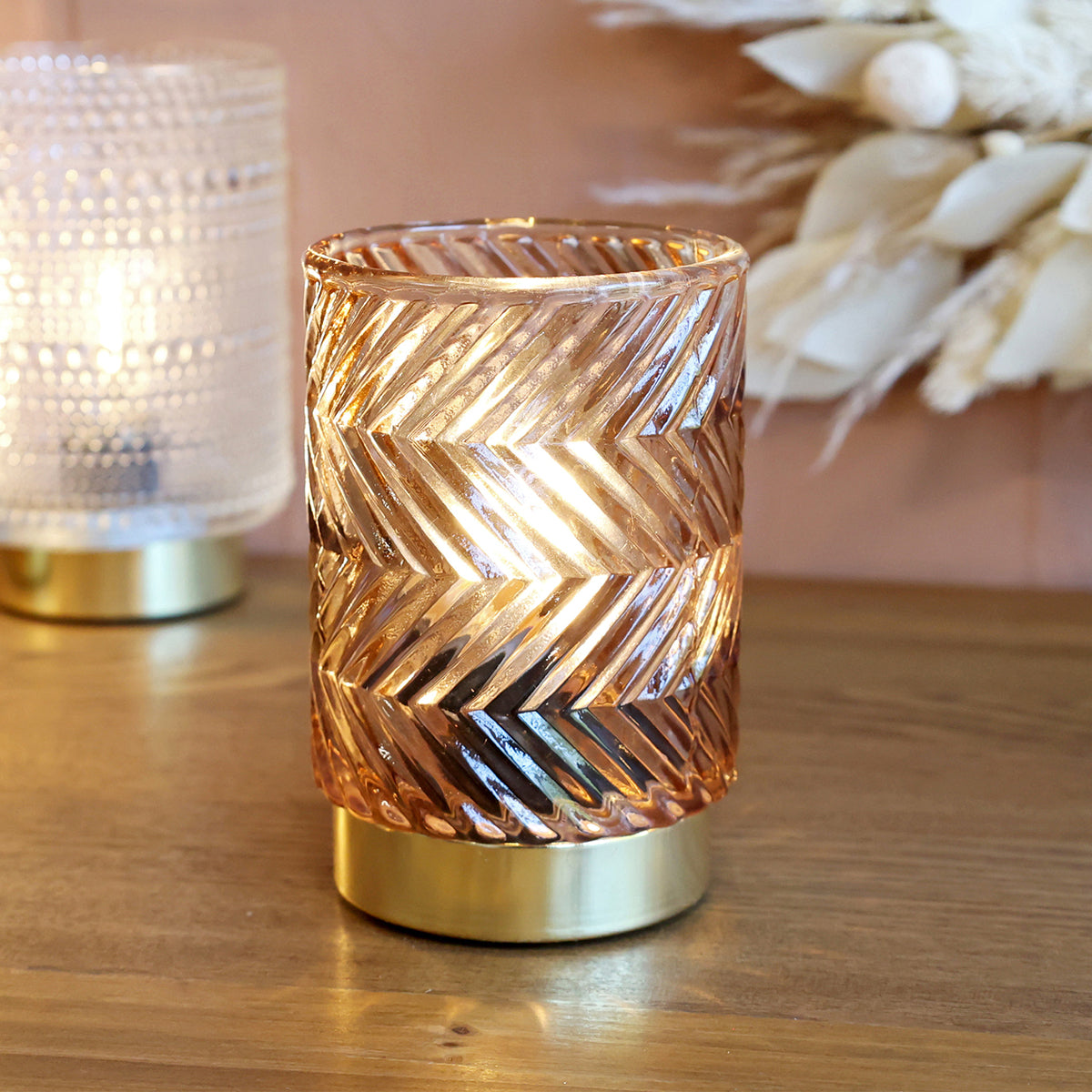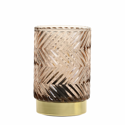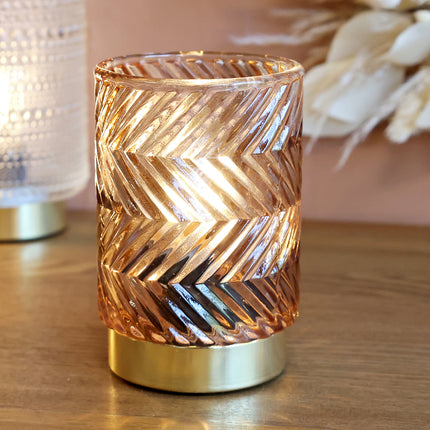 En liten men stämningsfull ljuslykta i färgat glas med ett klassiskt fiskbensmönster. Den varma LED-glödlampan ger ett mjukt sken som skapar mys utan öppen låga - perfekt för barnfamiljer, hyllor eller fönster där levande ljus inte passar.