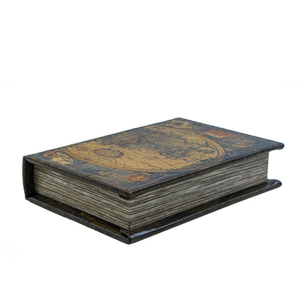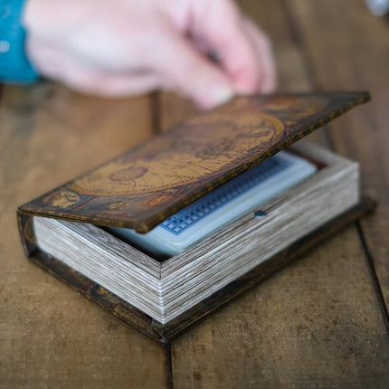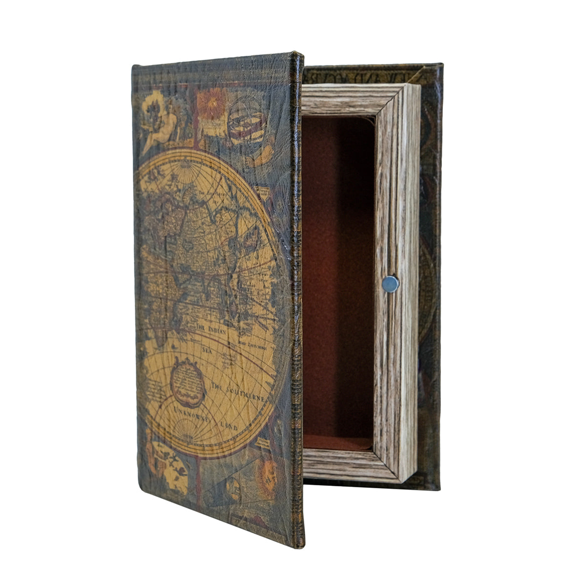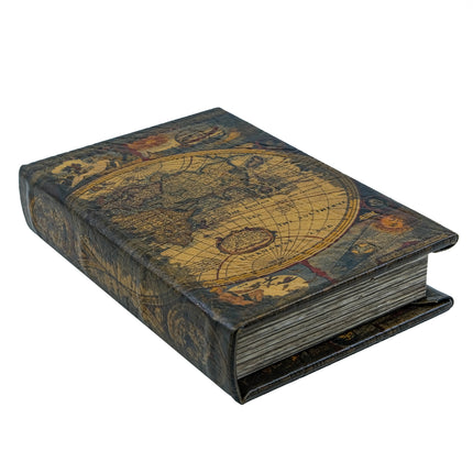 En charmig liten boklåda för dig som älskar det oväntade. På utsidan ser den ut som en gammal, vacker bok med vintageinspirerat världskartsmotiv - men öppna pärmarna så avslöjas ett hemligt fack att förvara dina små skatter i. Perfekt till kortleken, småsaker eller varför inte ett dolt godisförråd? Klädd i fuskläder med detaljer i trä och textil för rätt känsla.