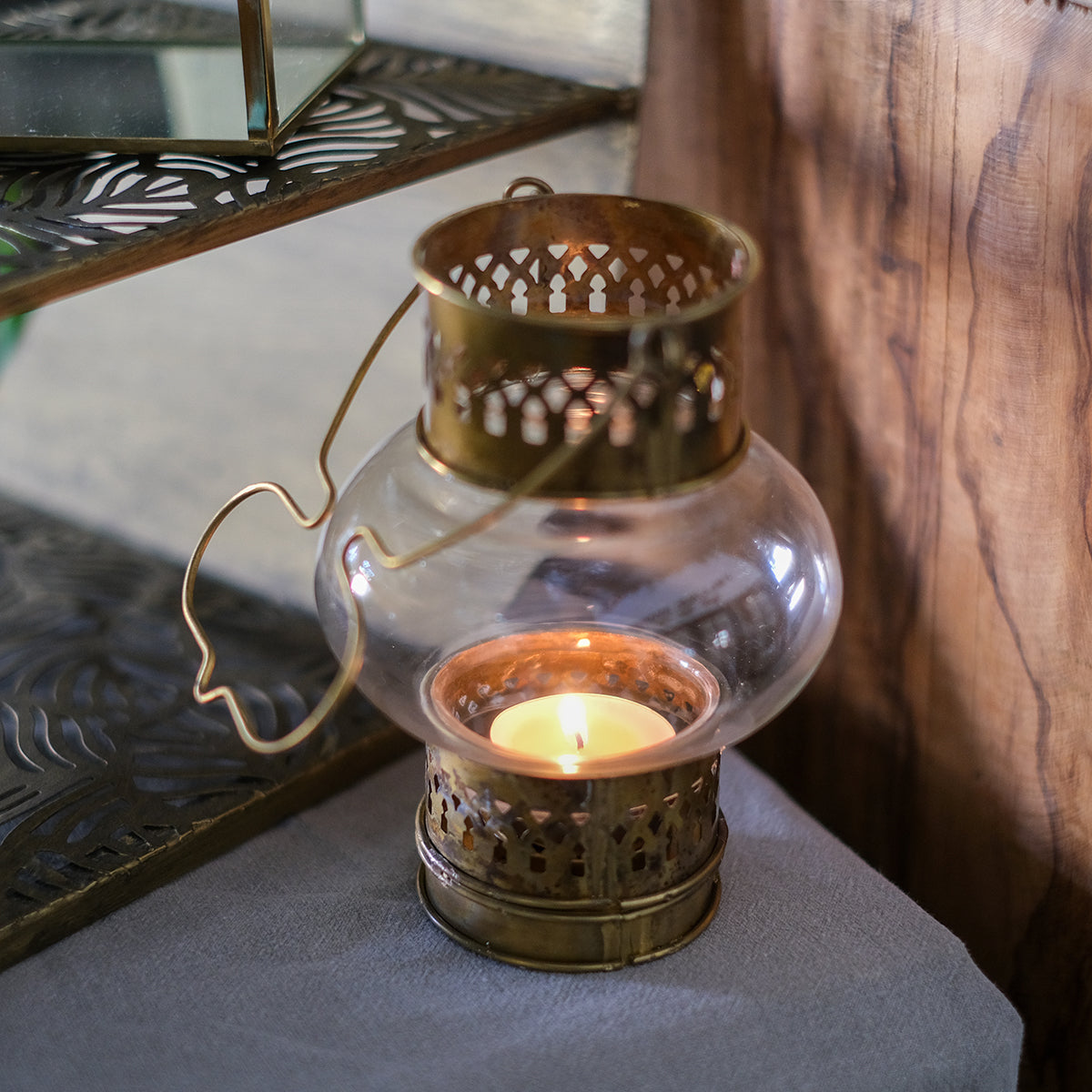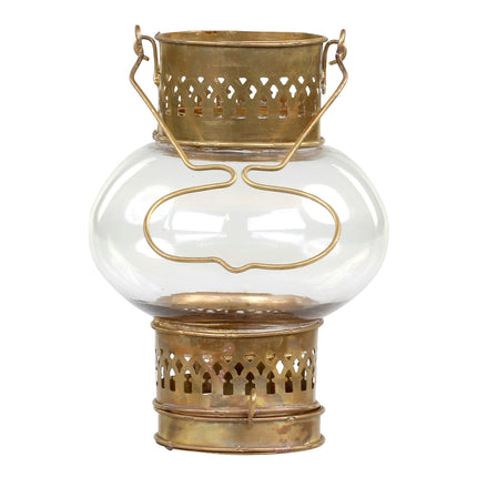En charmig liten lanterna i mässing och glas som sprider ett varmt sken och skapar mysig stämning. Designen är finurlig och dekorativ, med ett praktiskt handtag för flytt och upphängning.