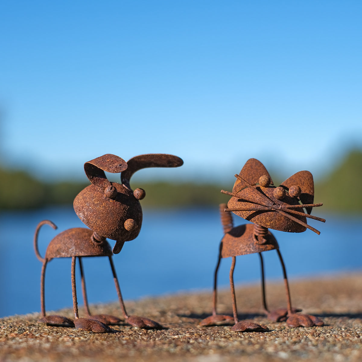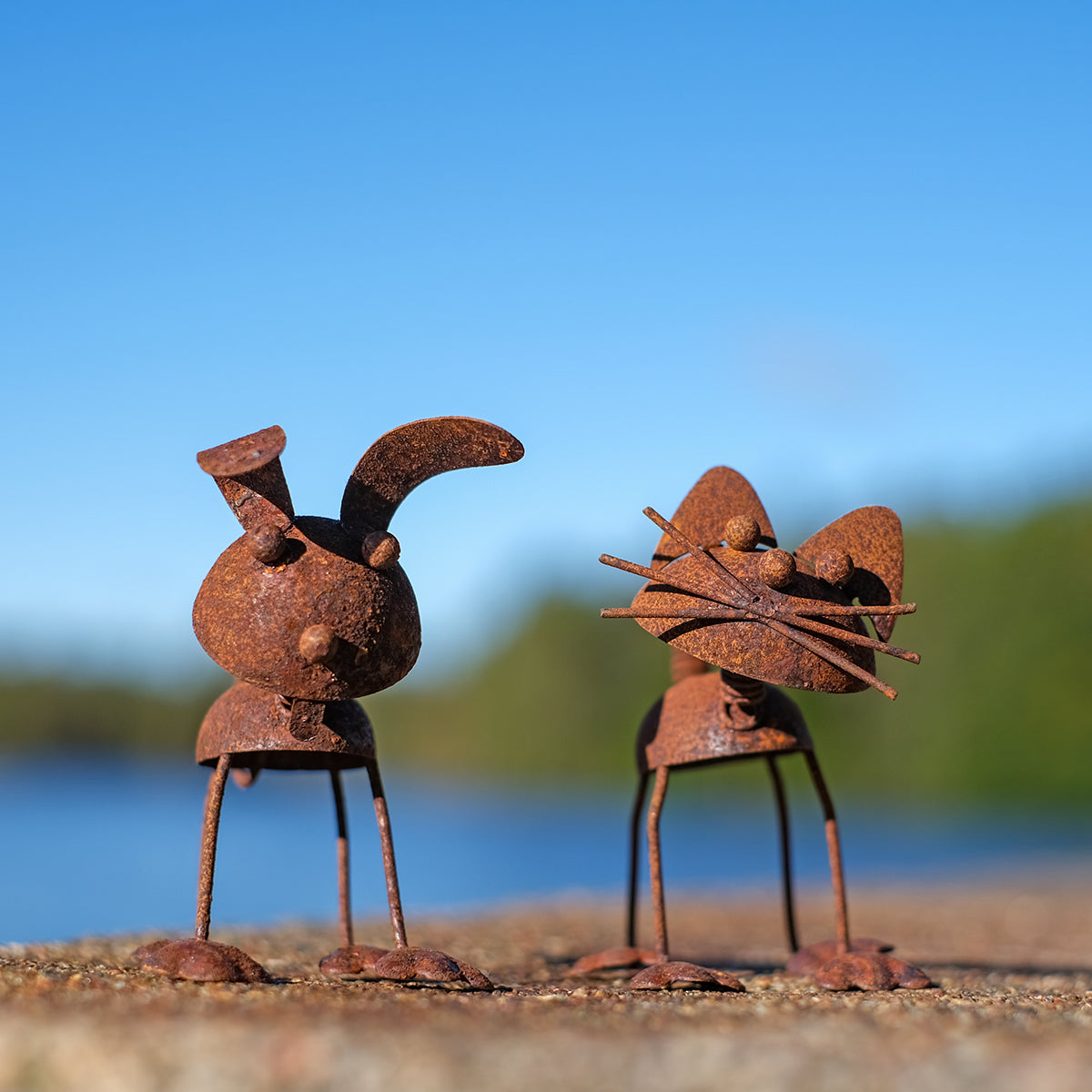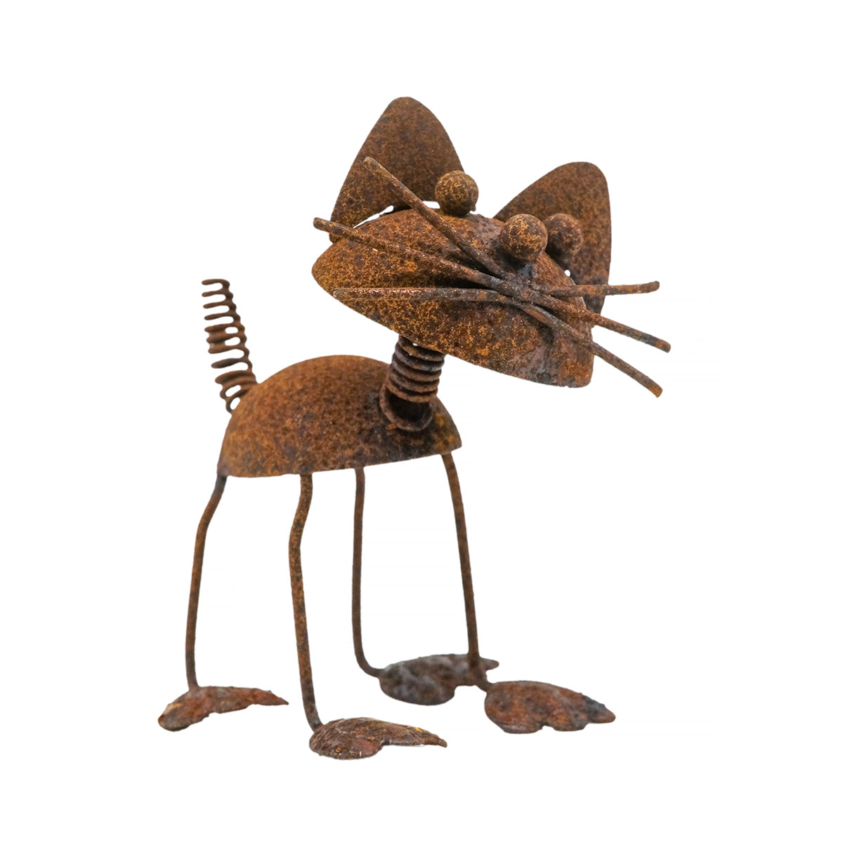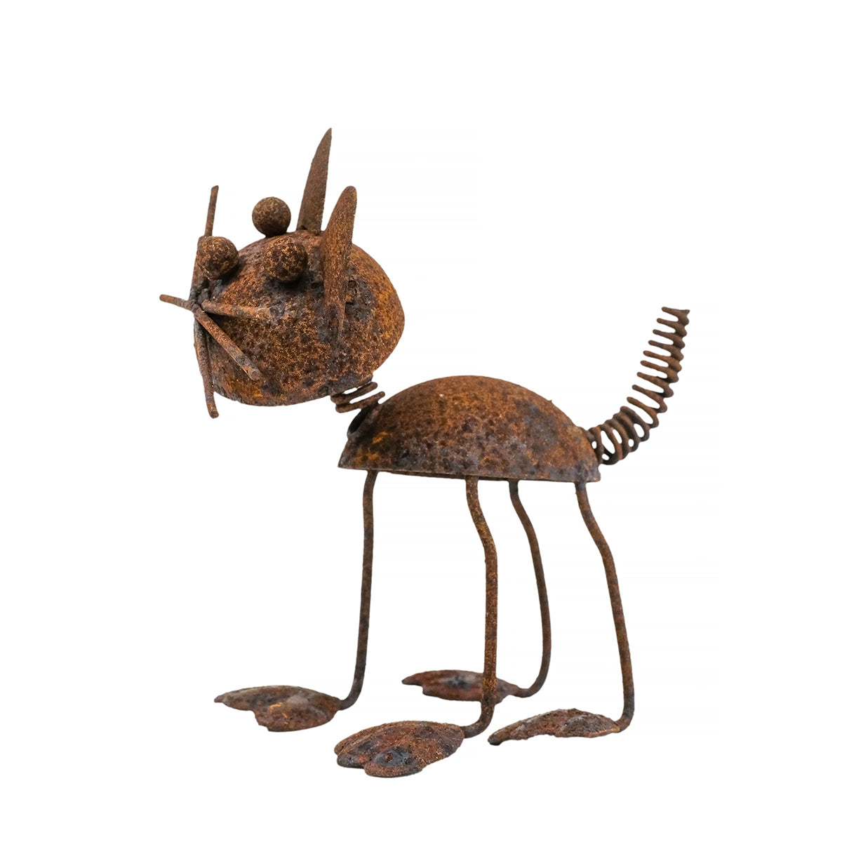 En liten och charmig katt i rostig metall. Med sina spetsiga öron, runda ögon och svans på spiralfjäder sprider den både humor och personlighet. En rolig detalj i hemmet eller trädgården – lika söt ensam som i sällskap med sin hundkompis i samma serie.