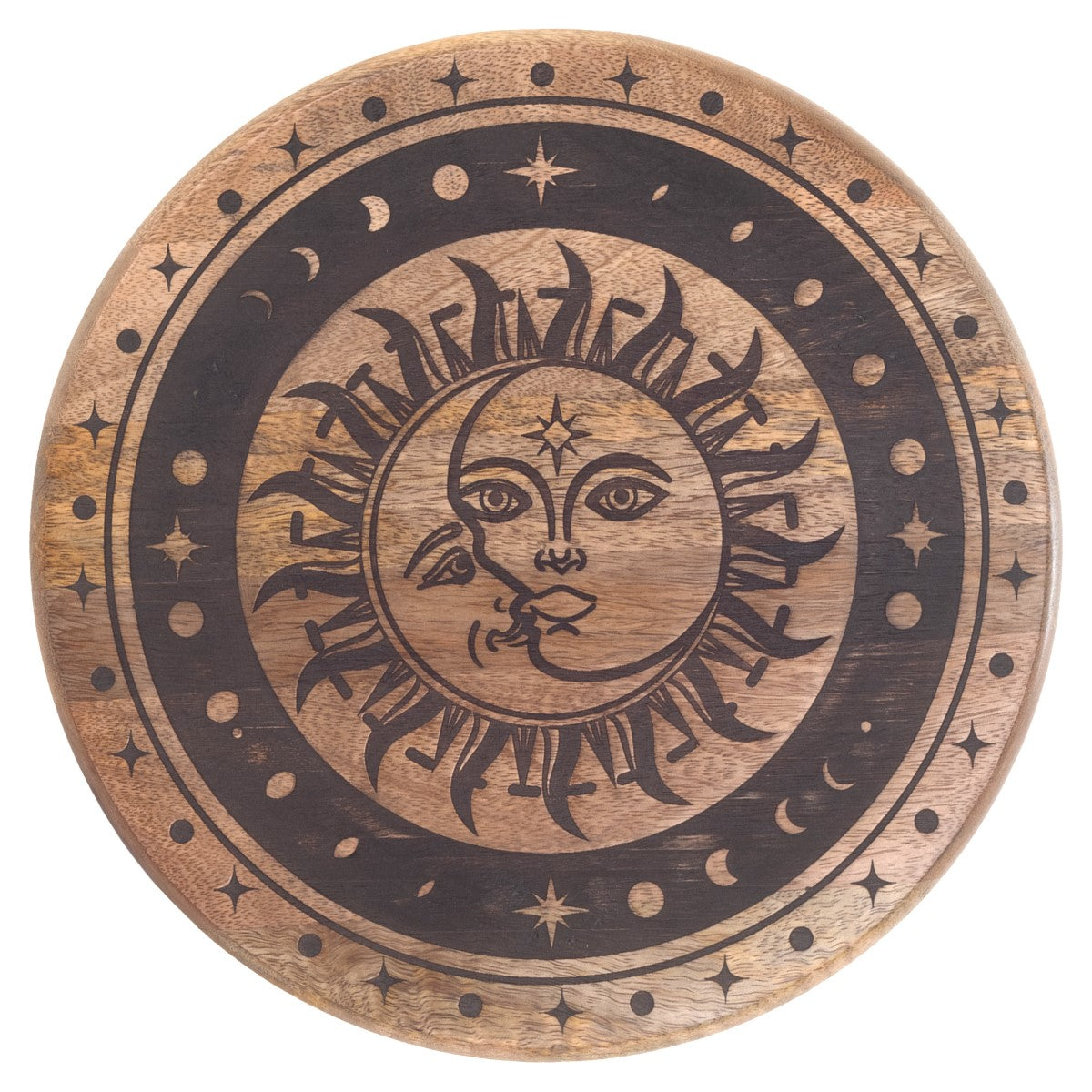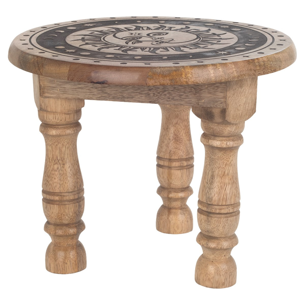 Ett litet runt bord i trä med svarvade ben och ett dekorativt snidat mönster på bordsskivan. Mönstret föreställer sol och måne i samspel, omgivet av stjärnor och månfaser, utfört i en mörkare ton som kontrasterar mot träets naturliga yta.