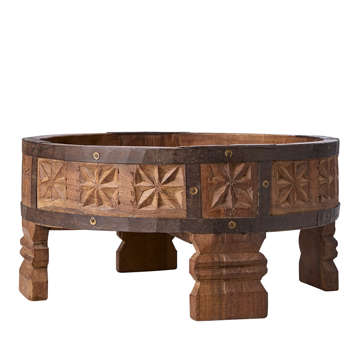 Ett vackert litet indiskt så kallat chakki-bord i karvat trä med dekorativa metallbeslag. Den runda formen och de snidade mönstren ger det en tilltalande, genuin karaktär.