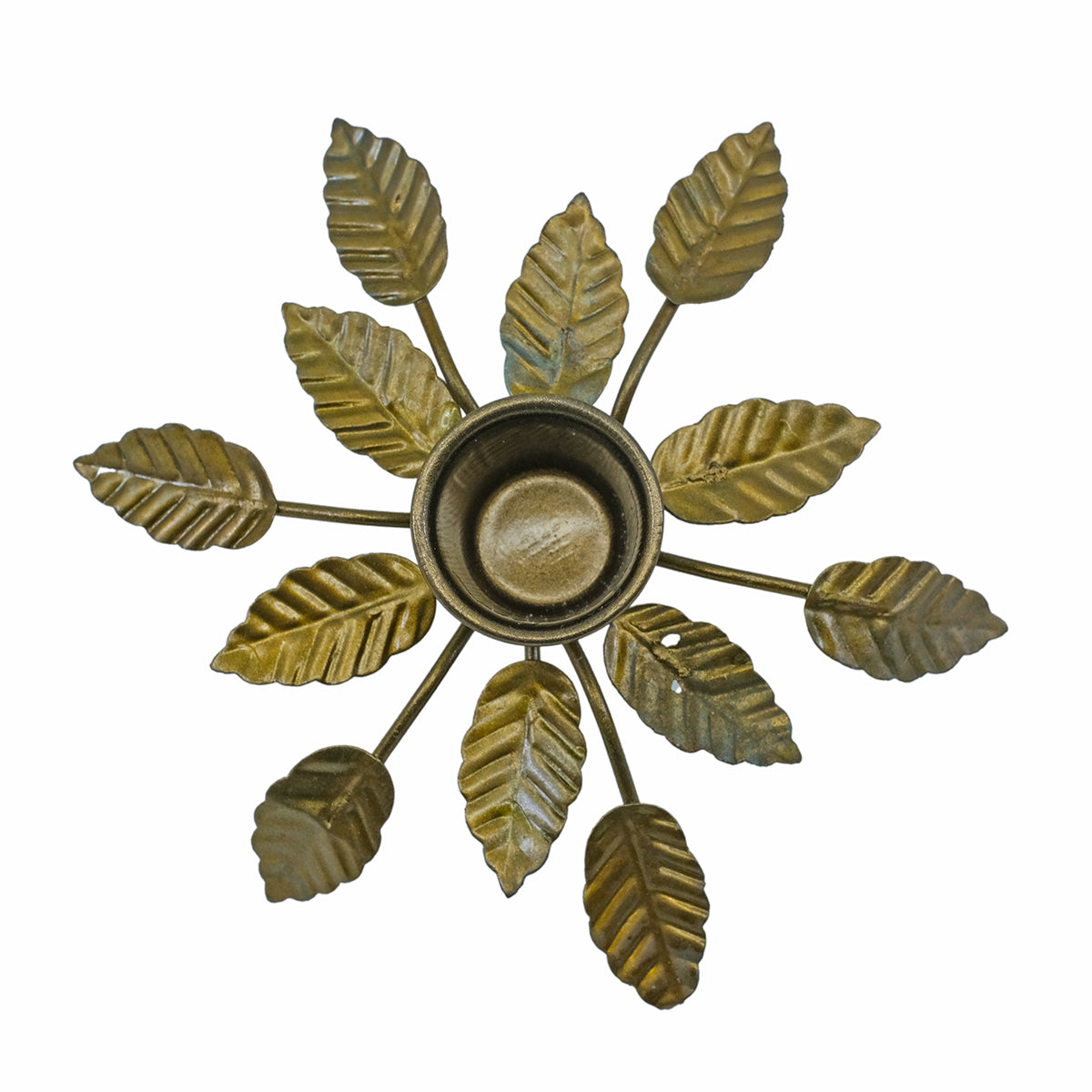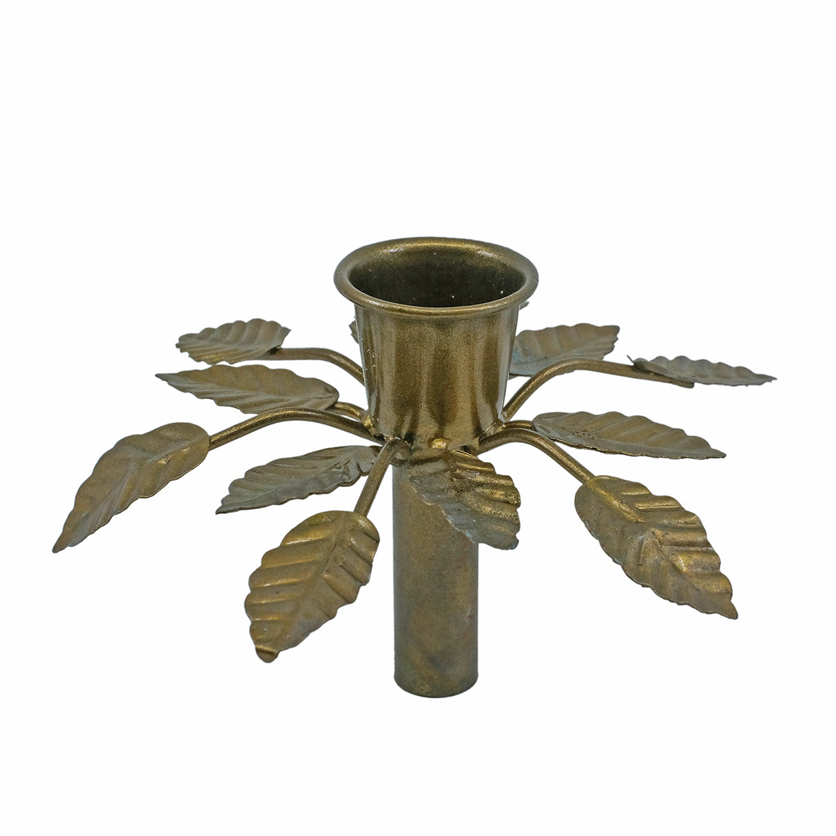 Förvandla en enkel flaska till en dekorativ ljusstake! Den här charmiga ljushållaren i metall är formad som en liten krans av blad, med en varm mässingsfärgad finish. Ett fint hantverk som ger ett både rustikt och elegant uttryck.
