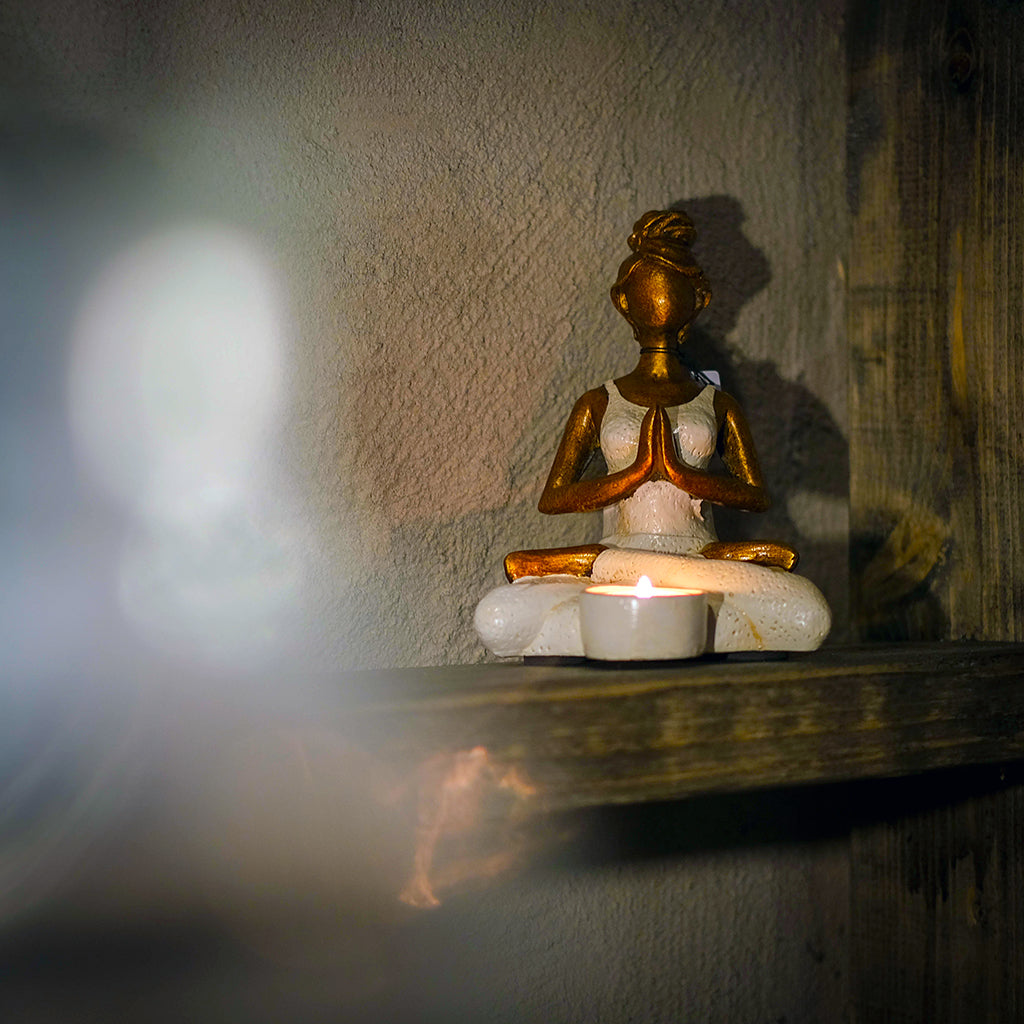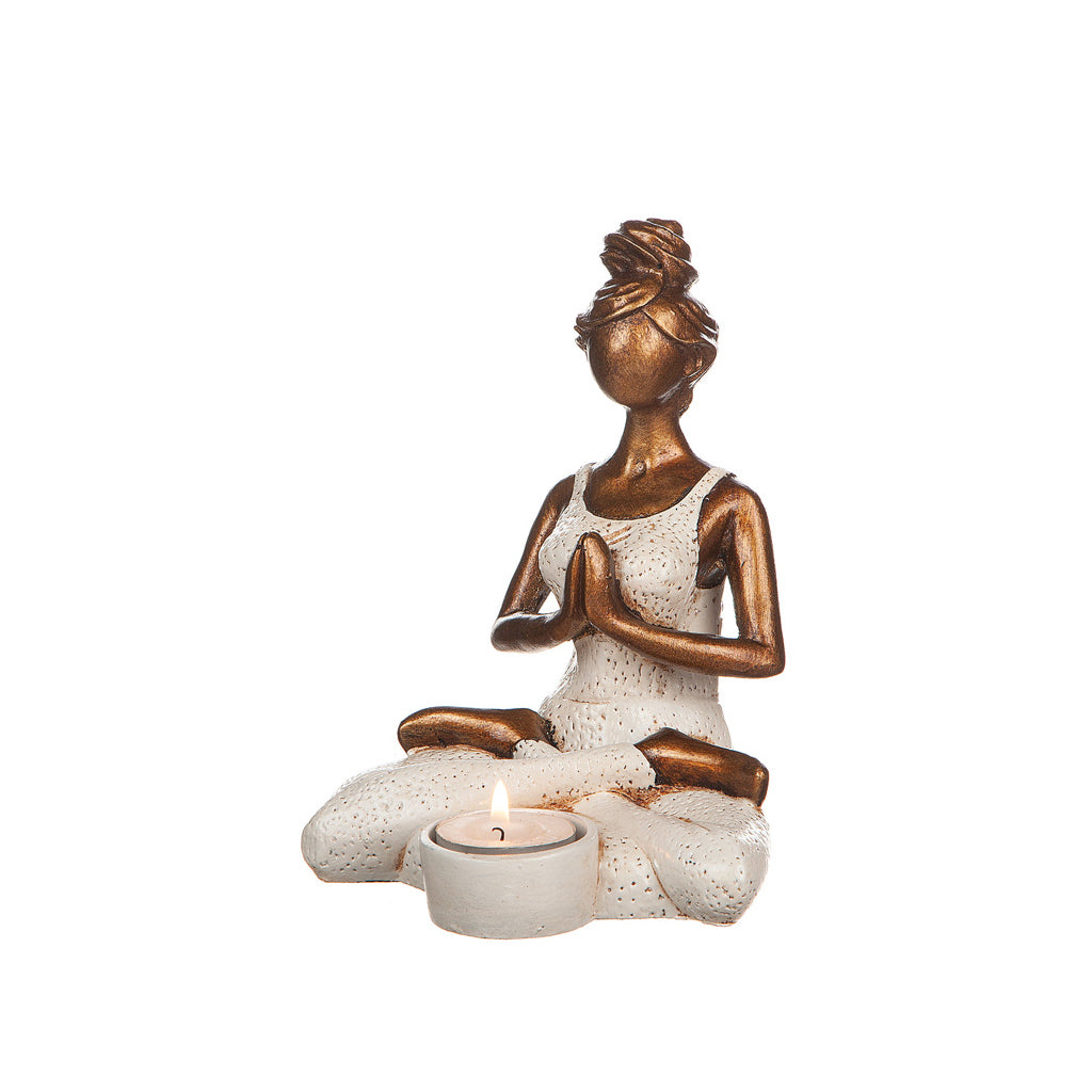Vacker värmeljushållare med tillhörnade vit yogakvinna.
