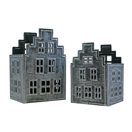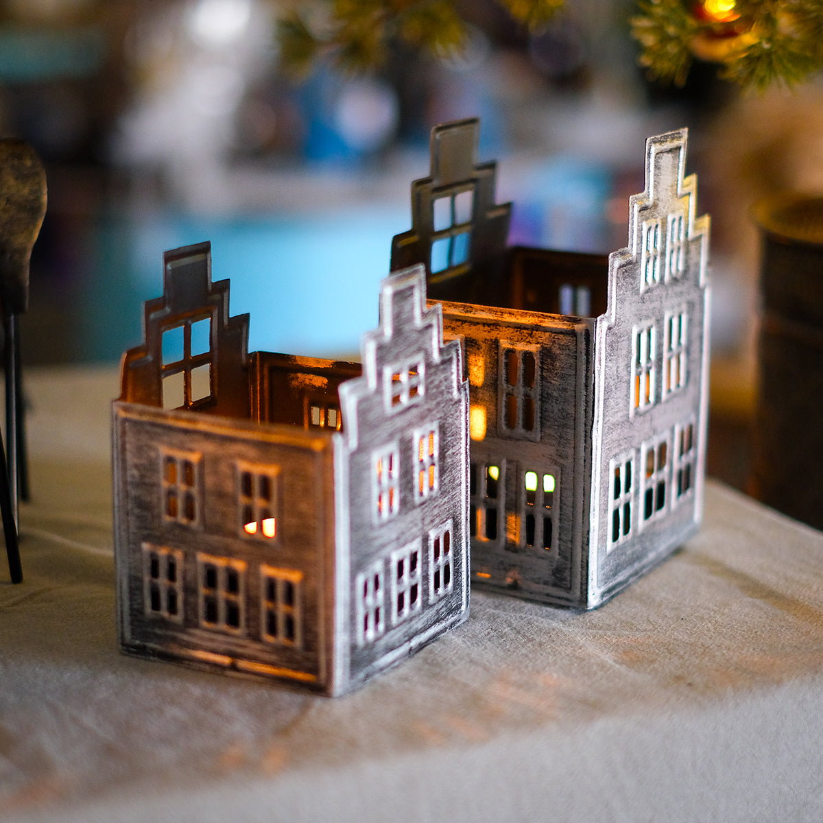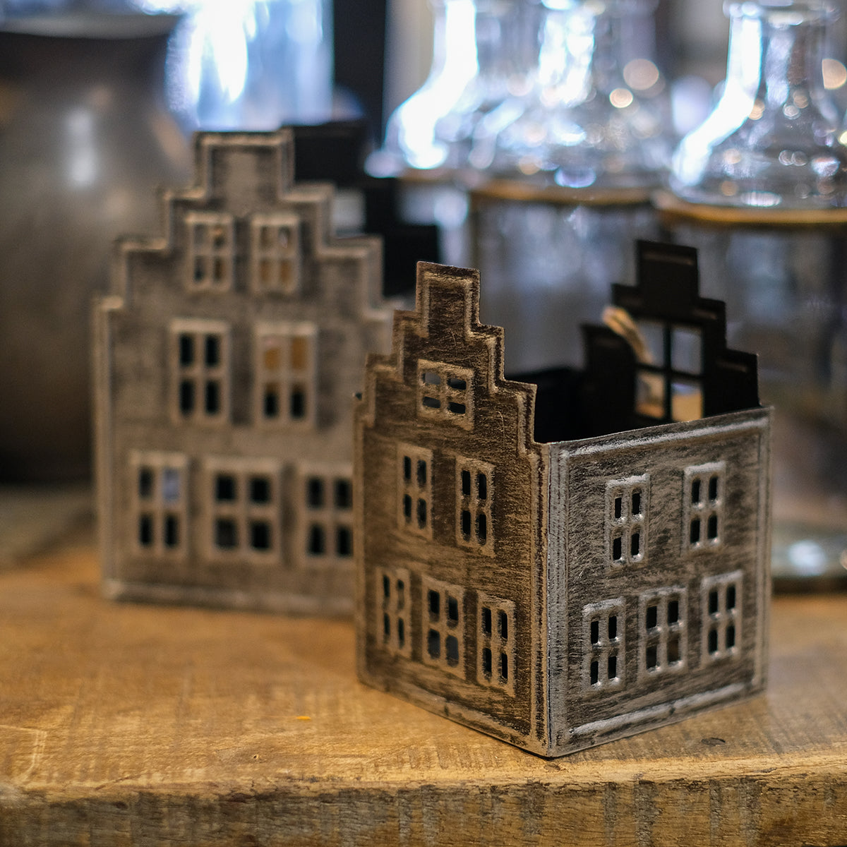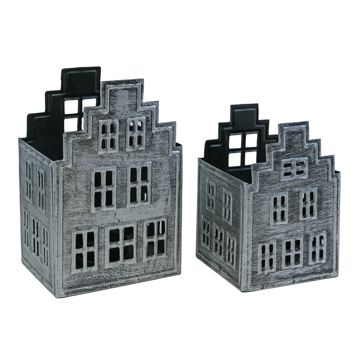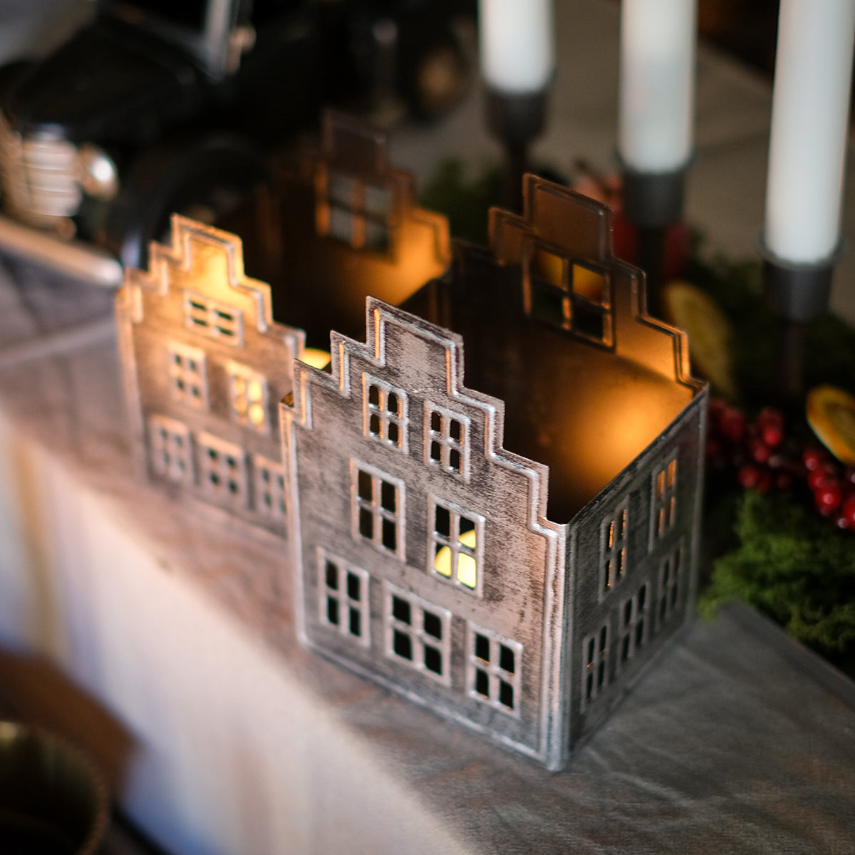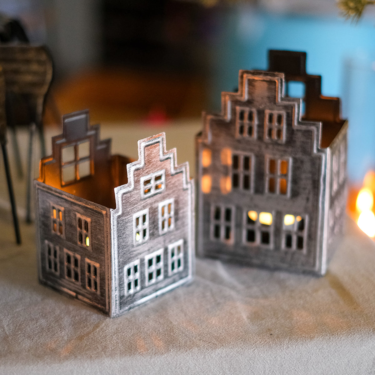 Två charmiga ljushus i metall med karaktäristiska trappstegsgavlar som för tankarna till gamla Hansa-städer som Visby eller Lübeck. Den slitna finishen ger dem en rustik känsla - perfekta att placera i fönstret eller på ett bord för att skapa stämningsfullt sken. Anpassade för värmeljus och säljs styckvis.