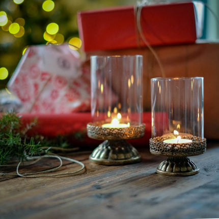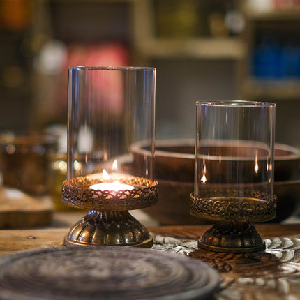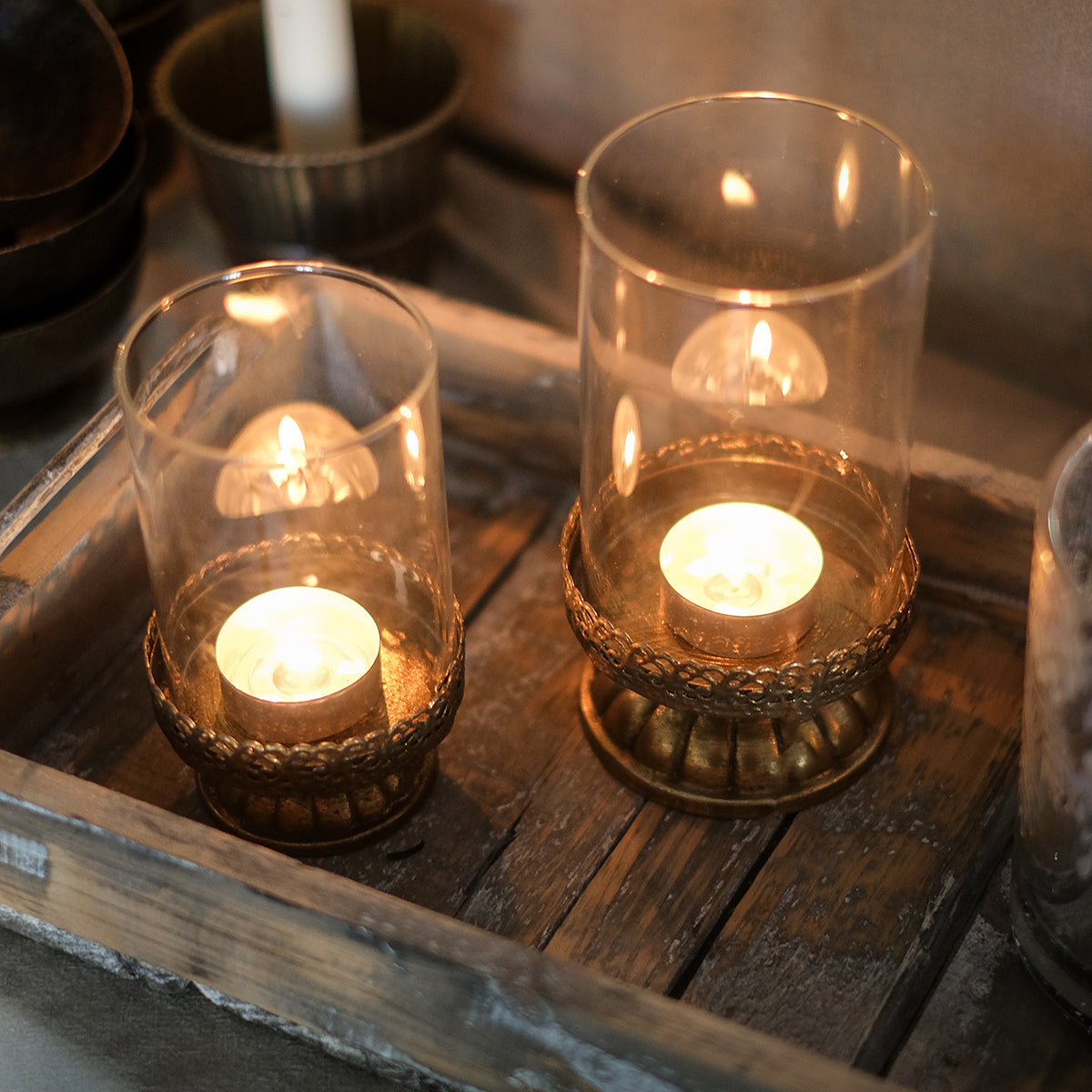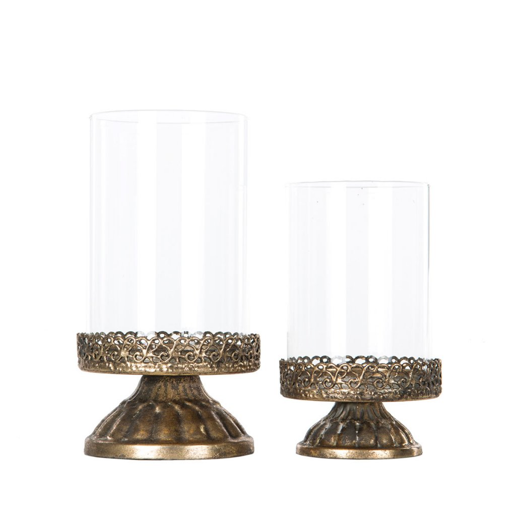 Ett set med två ljuslyktor av fint mönstrad metall och glas.