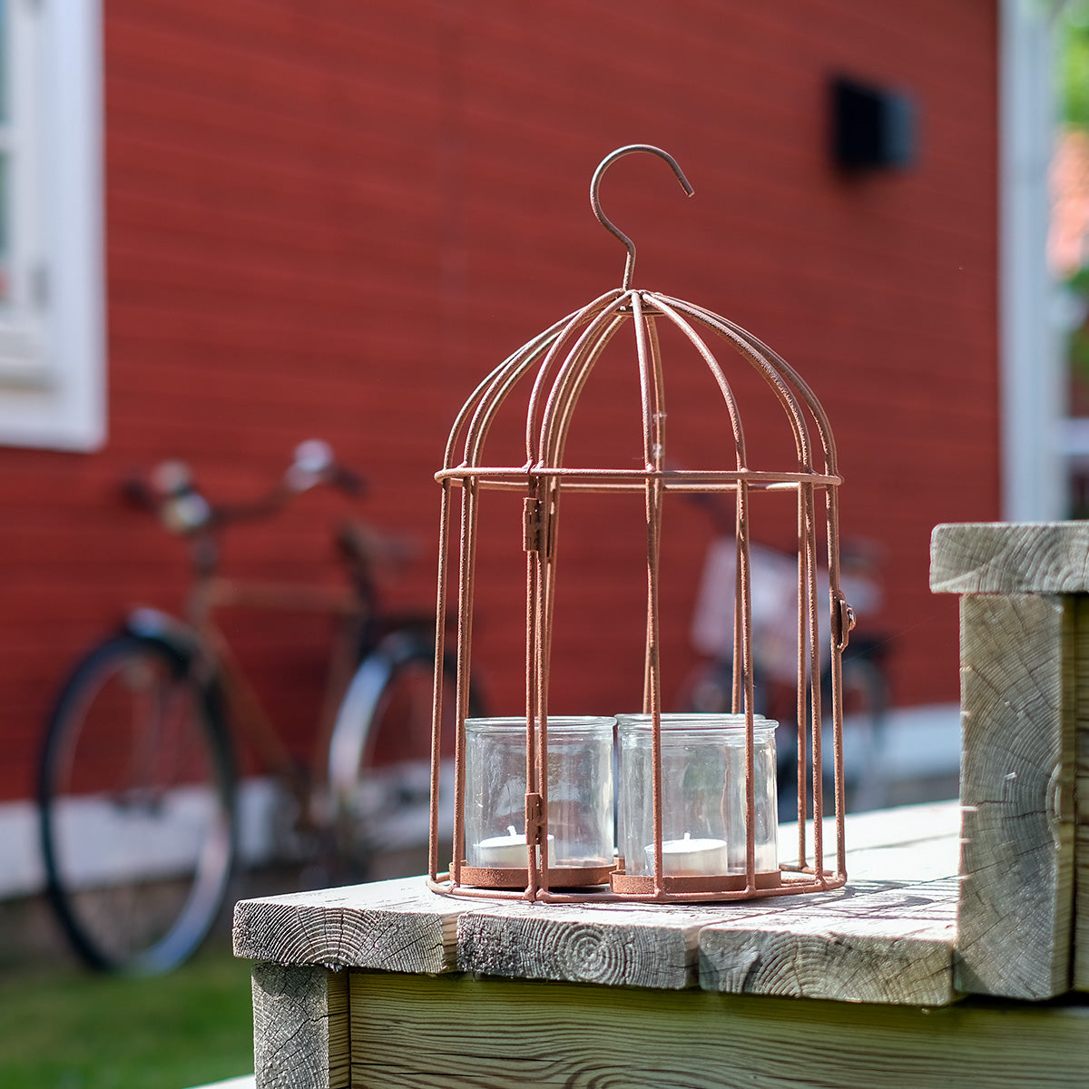 Supermysig ljuslykta i rostig metall formad som en klassisk fågelbur.