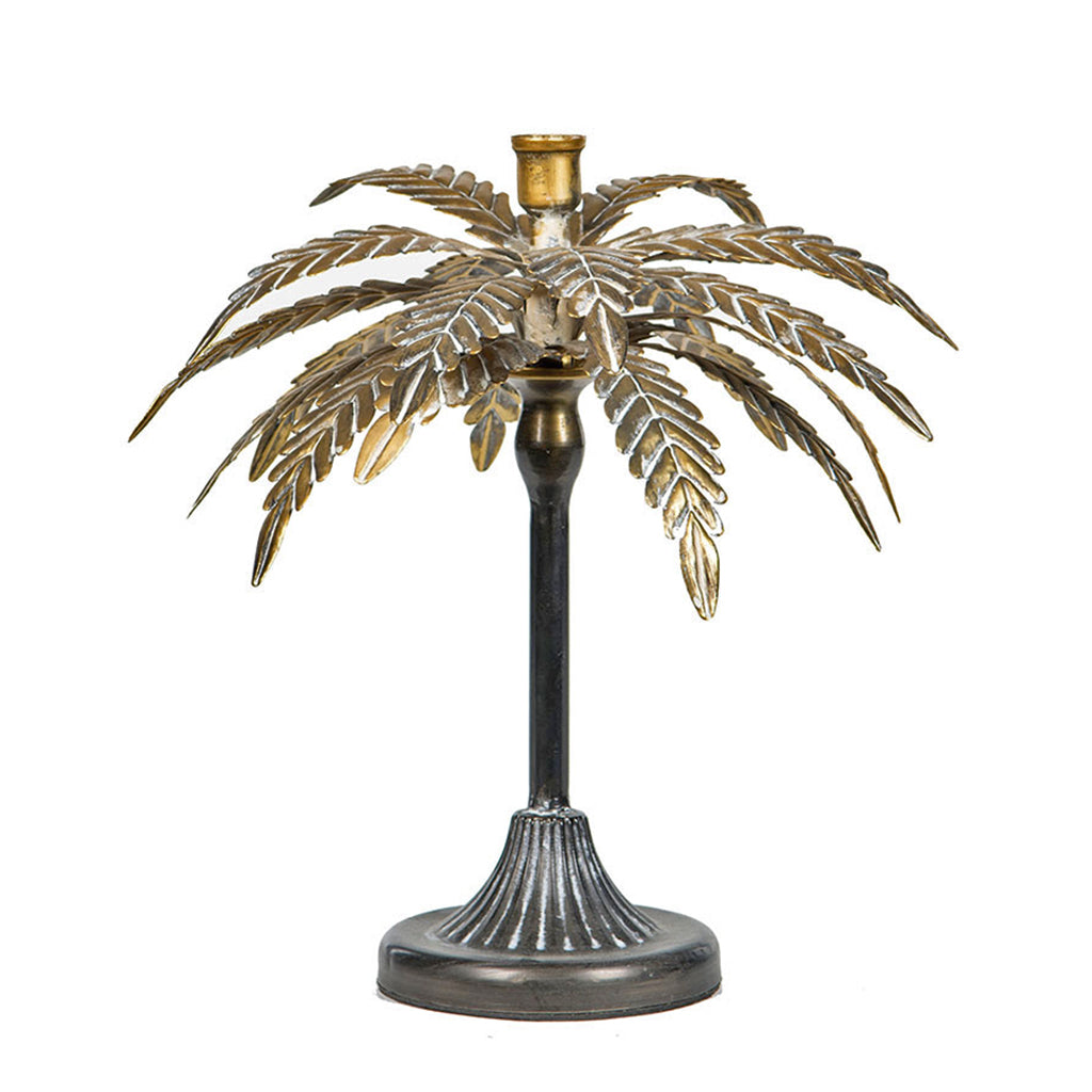 En elegant ljusstake med en vackert utformad palm i antik mässingsfinish. De detaljerade bladen ger en levande känsla, medan den mörka foten skapar en fin kontrast. En ljusstake som verkligen får ta plats och lyfter rummets inredning!